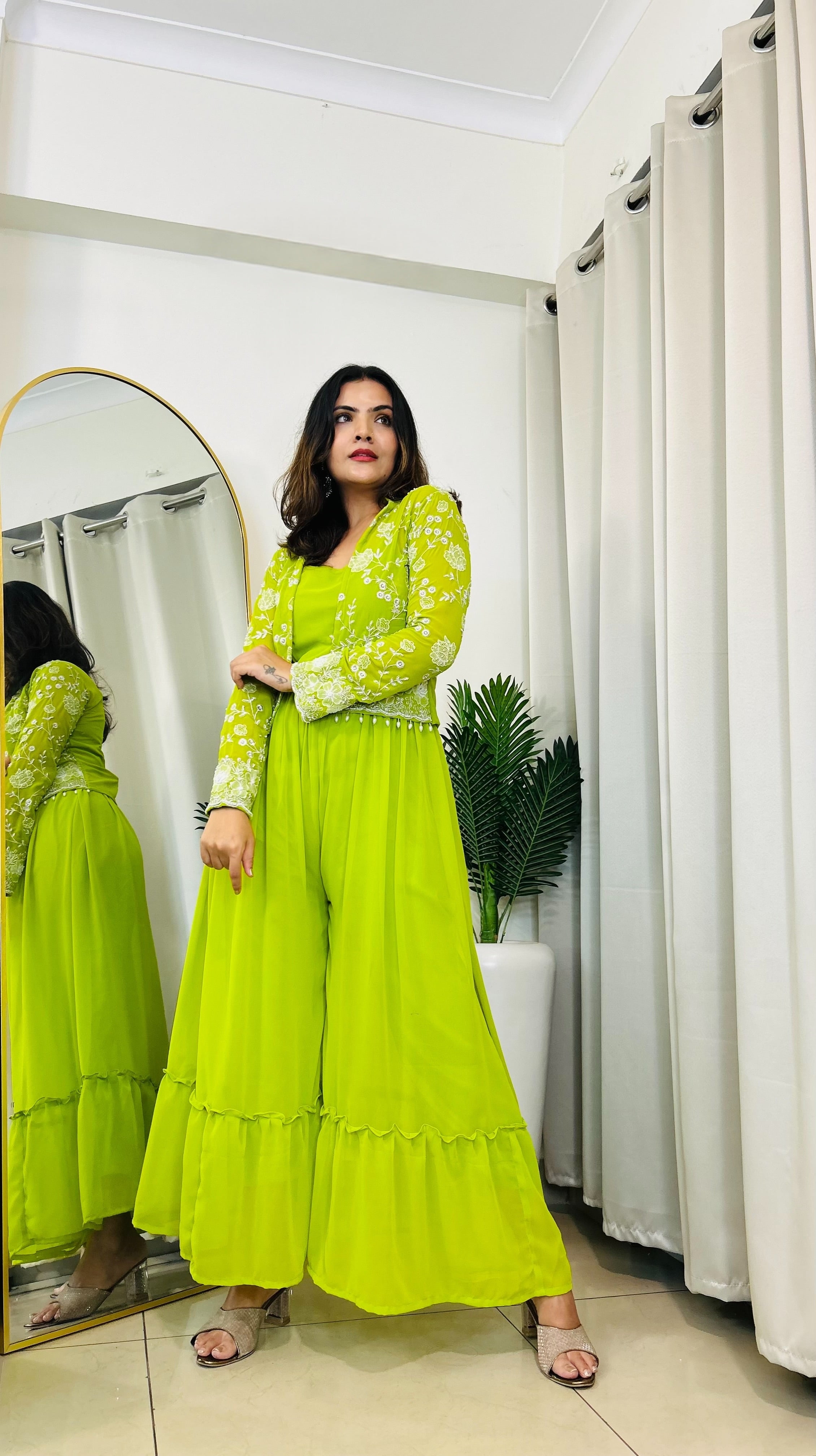Shop this stunning lime green embroidered palazzo set with matching jacket, crafted in flowy georgette fabric. Perfect for parties, festive occasions & weddings. Stylish, comfortable & trending ethnic wear for women.Perfect for Haldi & mehendi party .