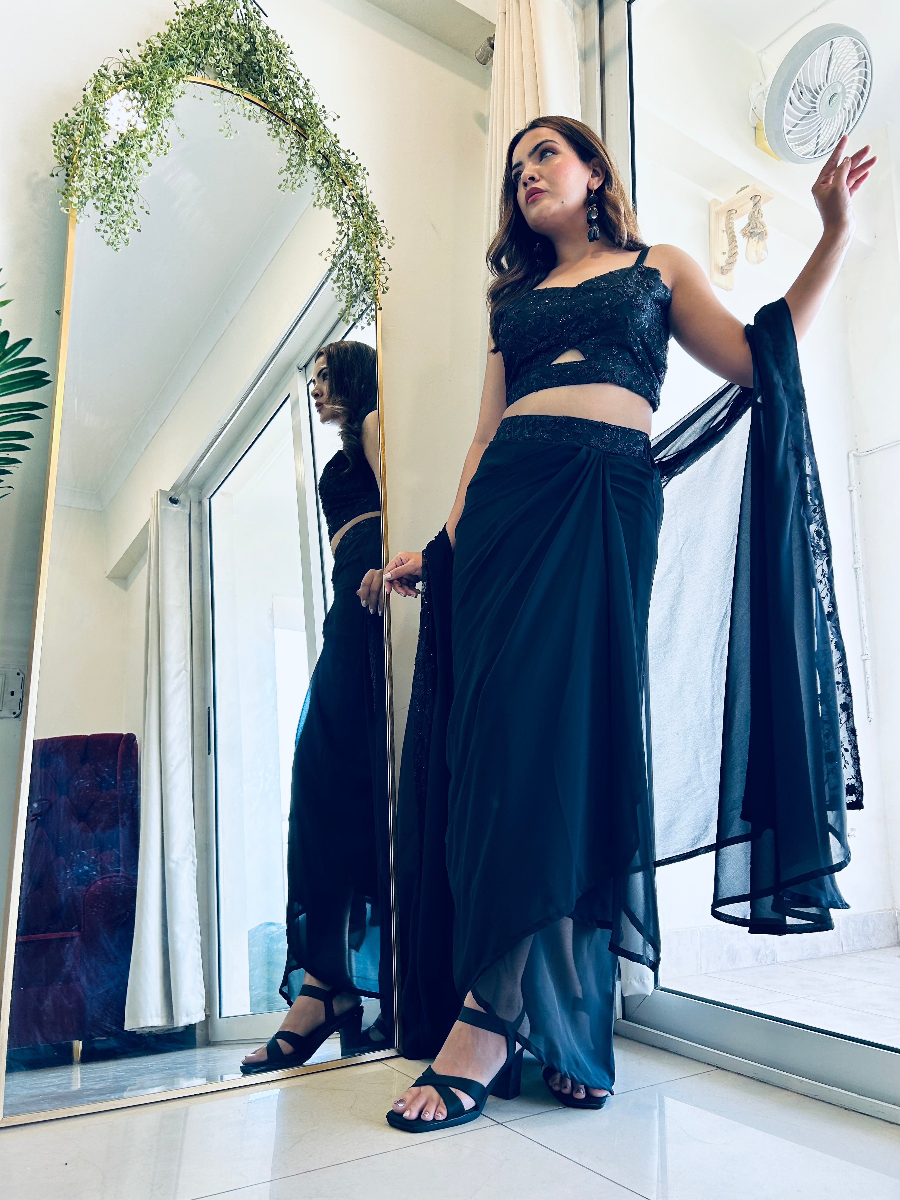 Designer & Partywear 3pc Black Drape Skirt Jacket Set for women perfect Cocktail & wedding outfit
