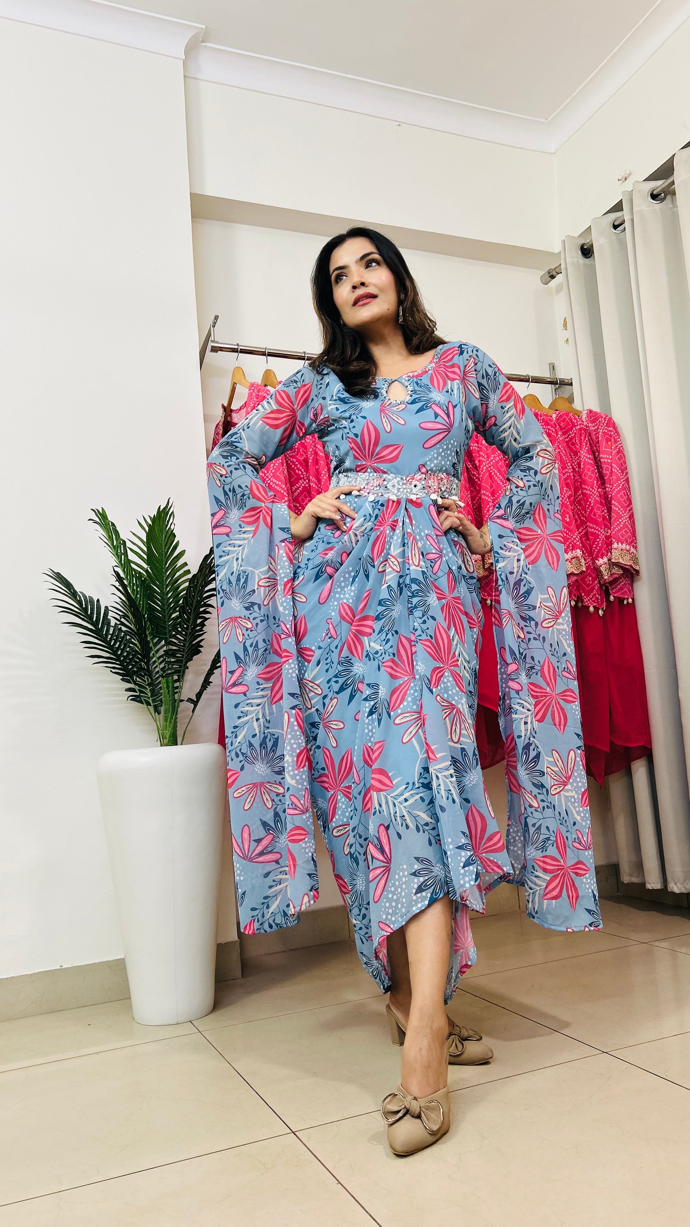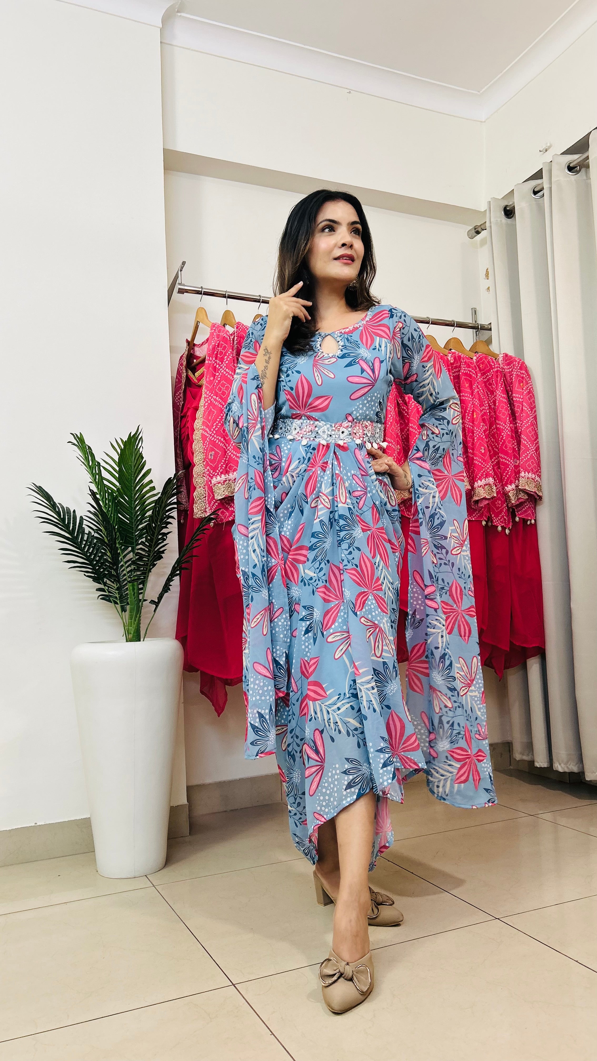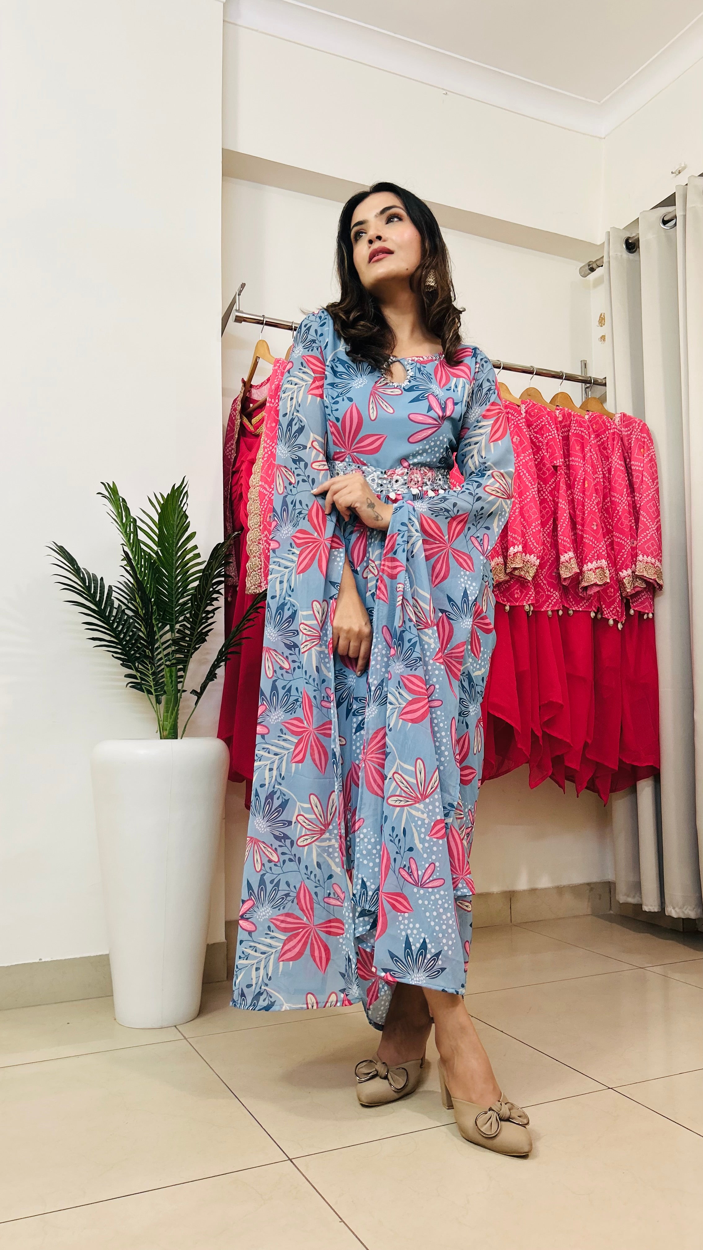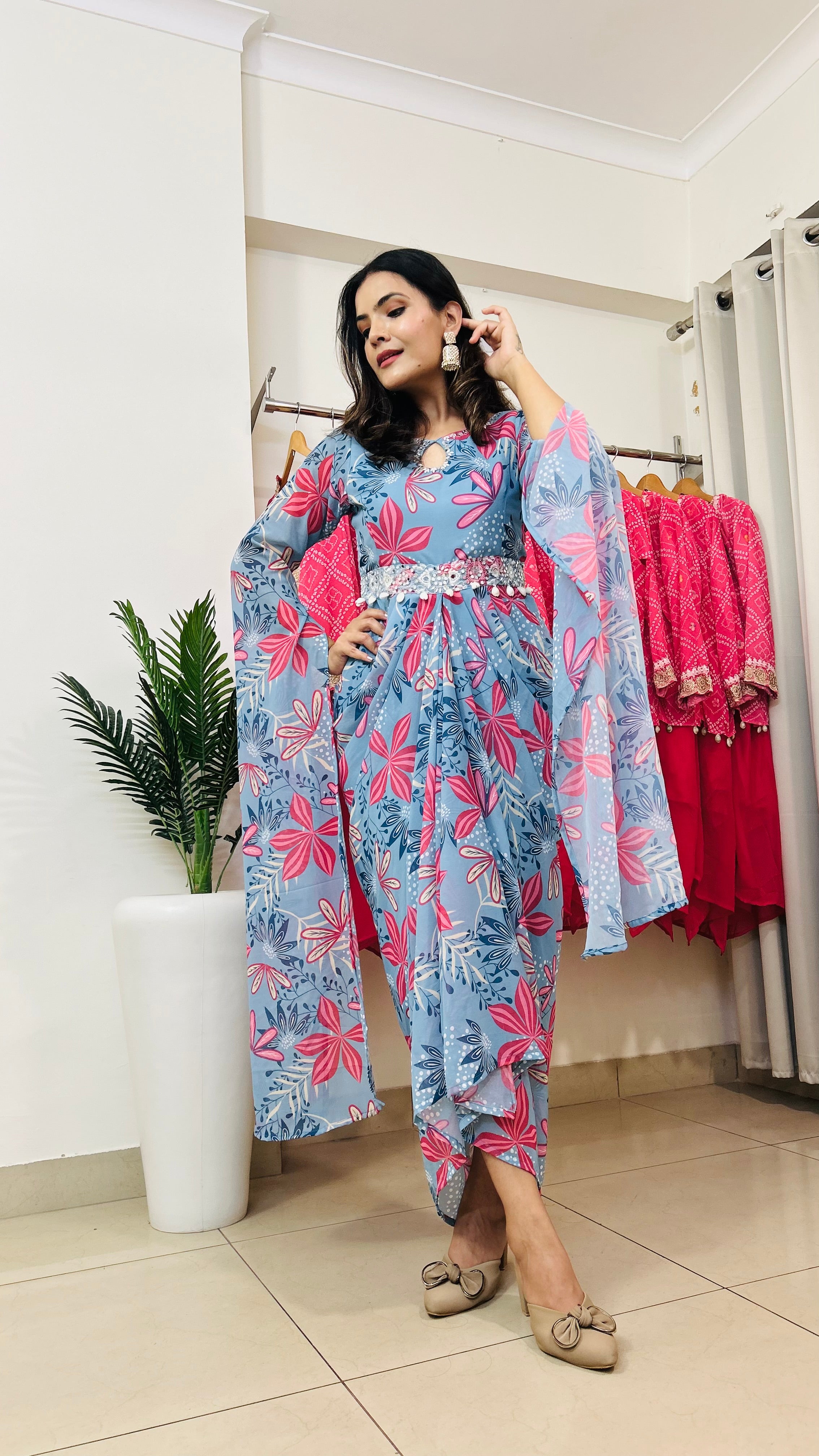 Designer 3pc Indowestern sarong outfit skirt ,top with flowy kaftan perfect wedding wear outfit for womens