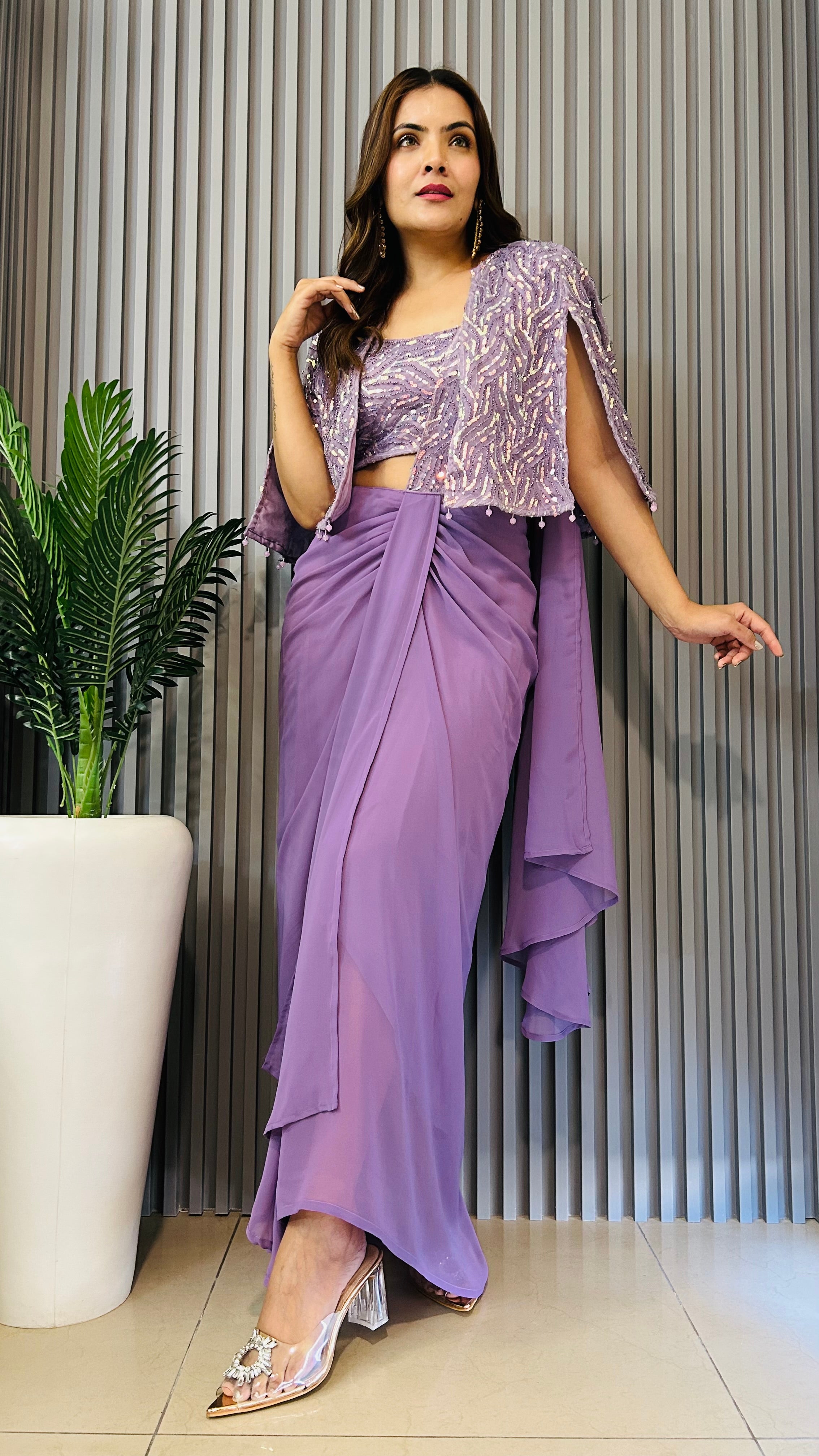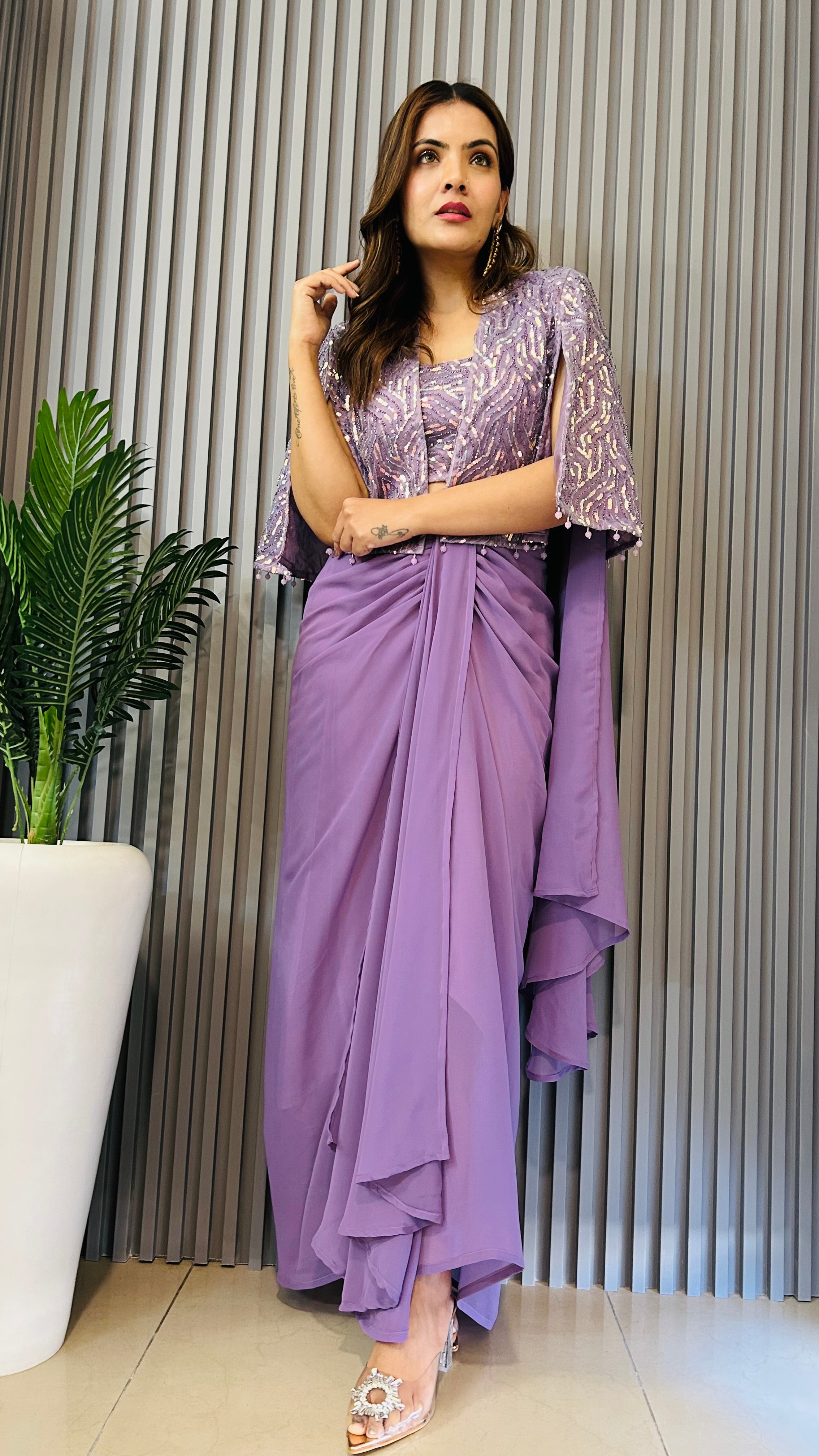 Designer ready to wear pre-draped saree with crop jacket in lavender perfect for wedding /cocktail
