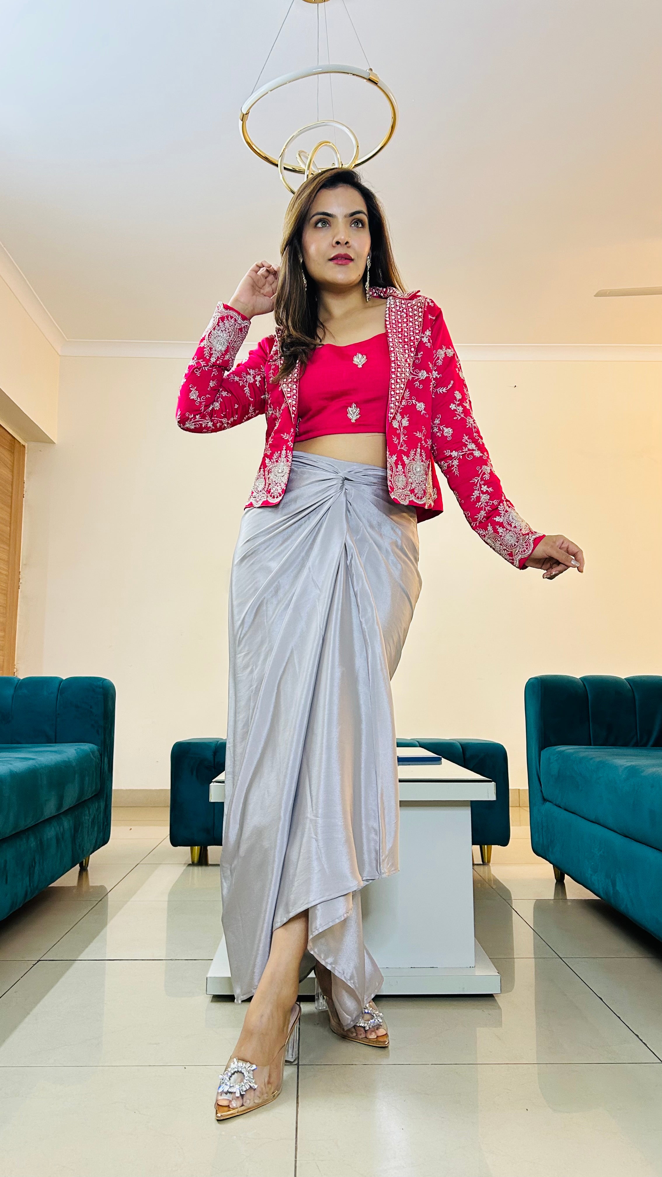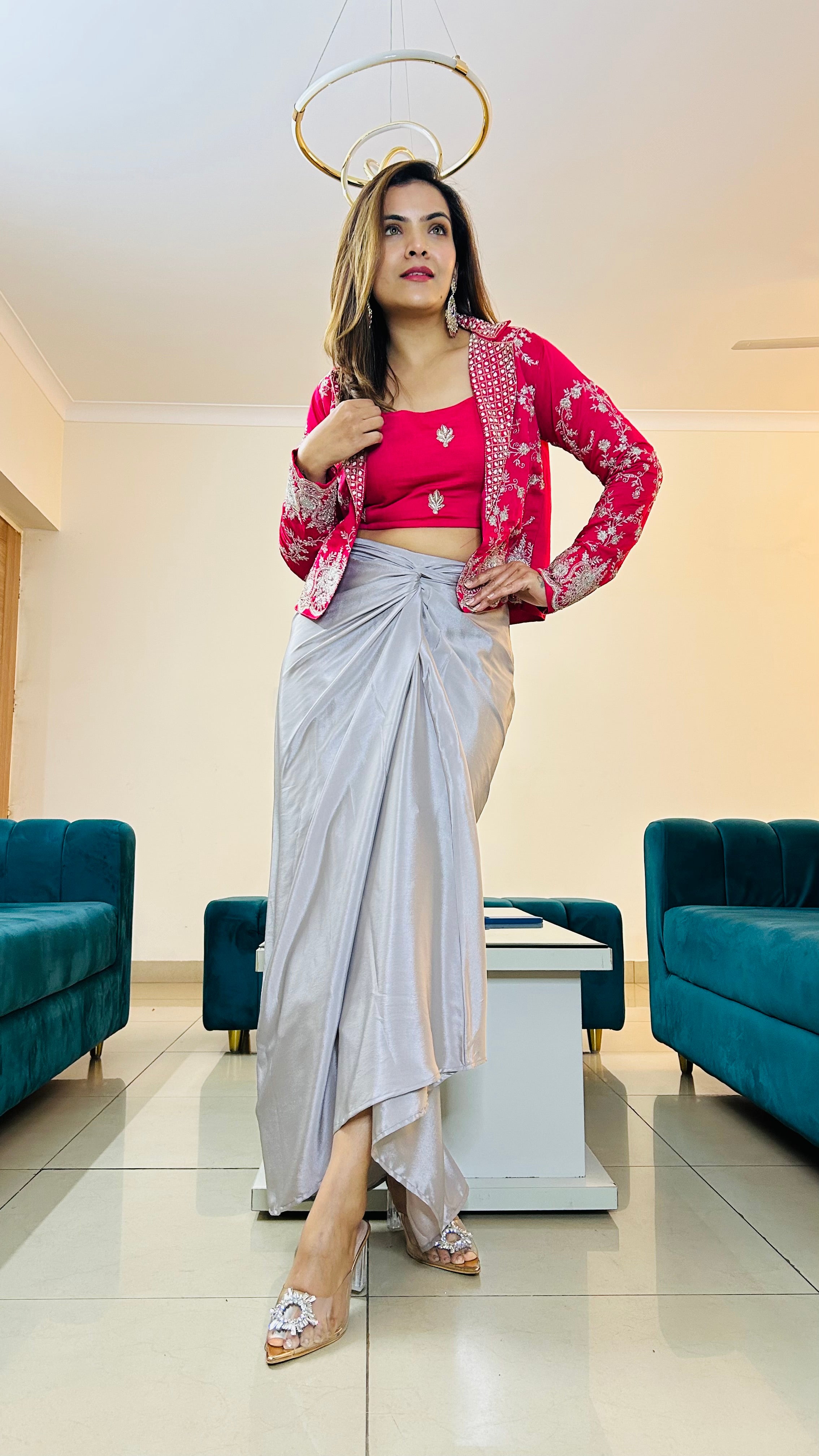 Supper trendy skirt jacket set for cocktail & weddings in blingy grey & rose red combination