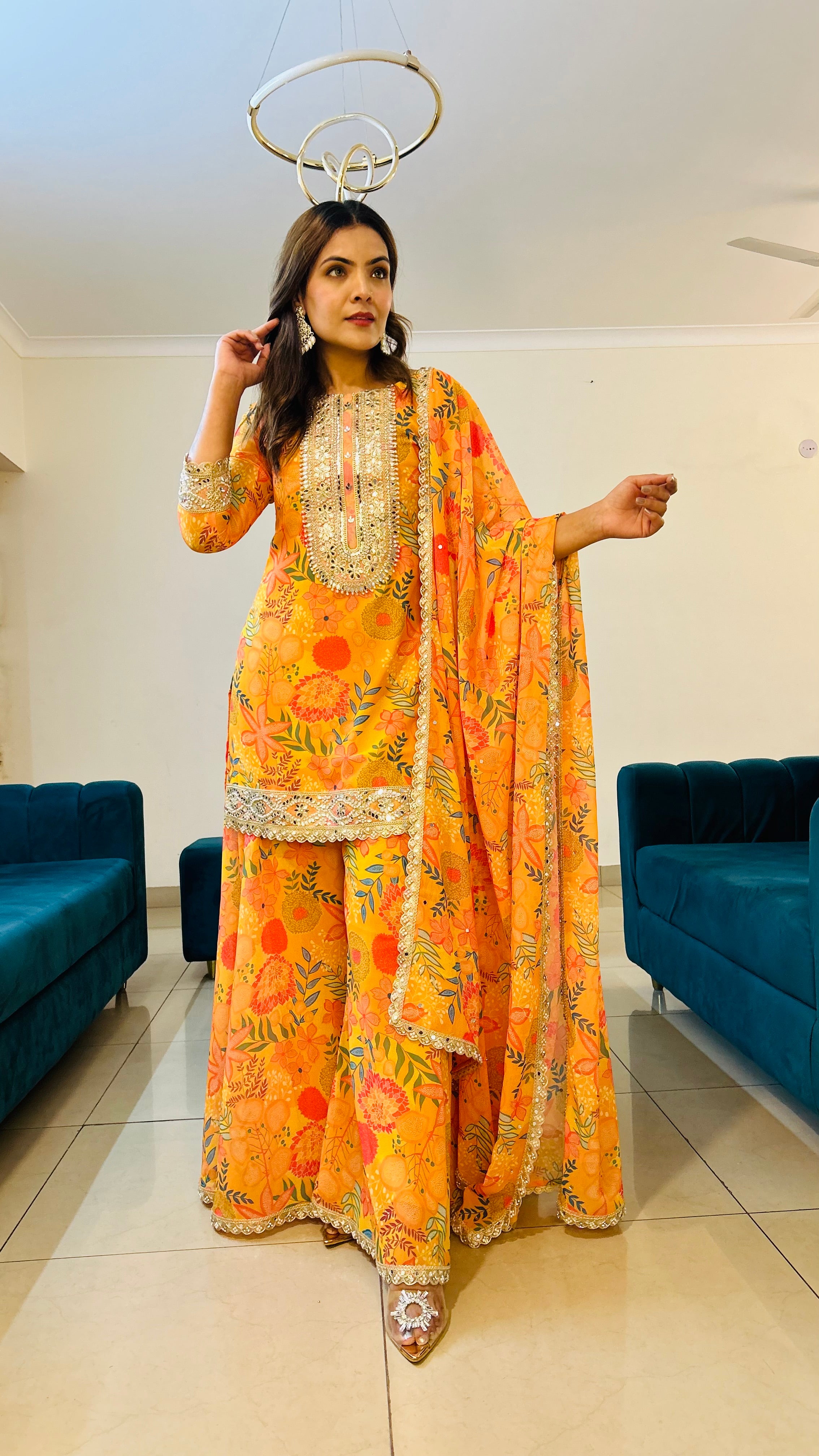 3pc Designer Floral sharara with dupatta perfect for Haldi & mehendi & occassions