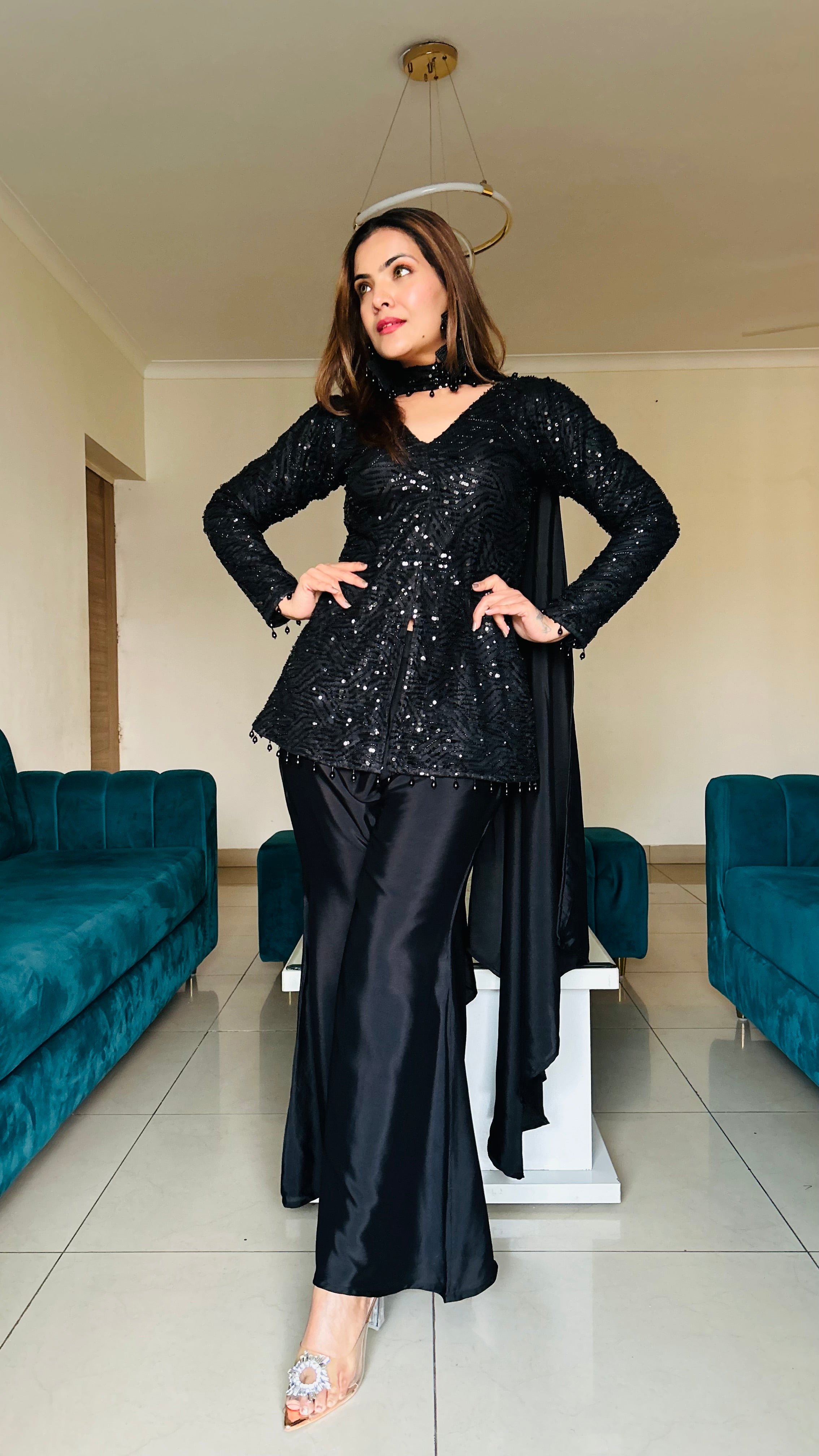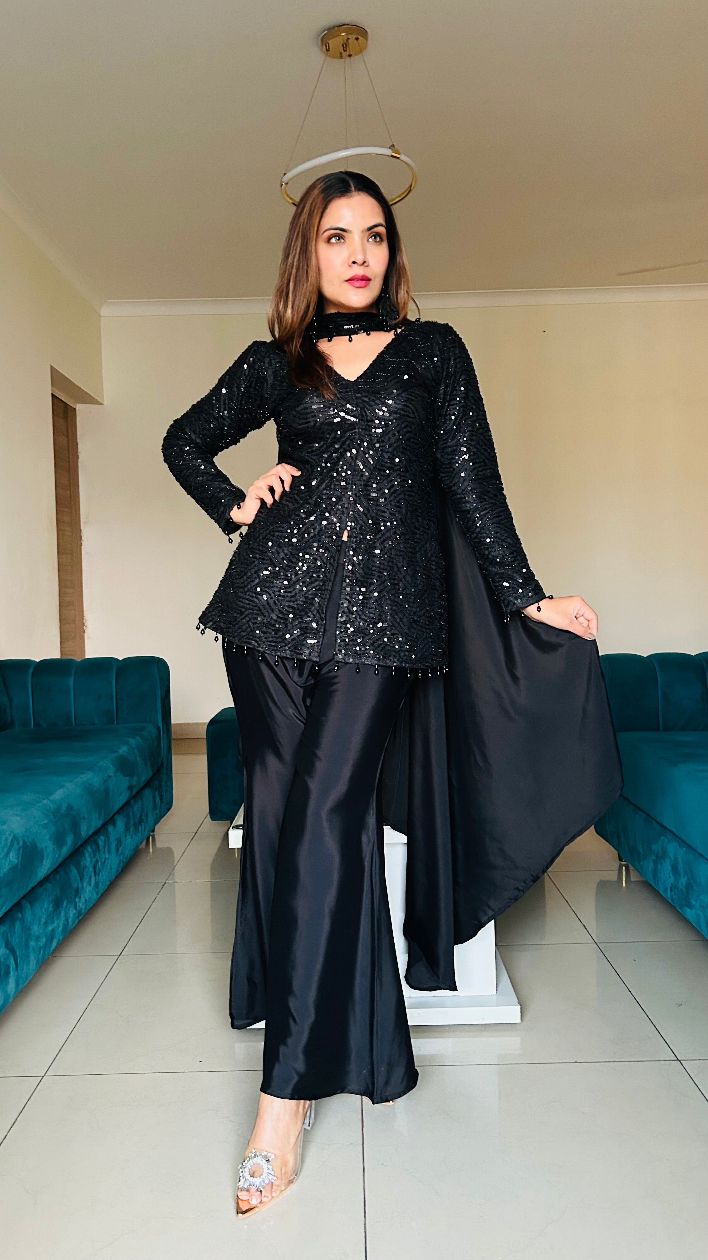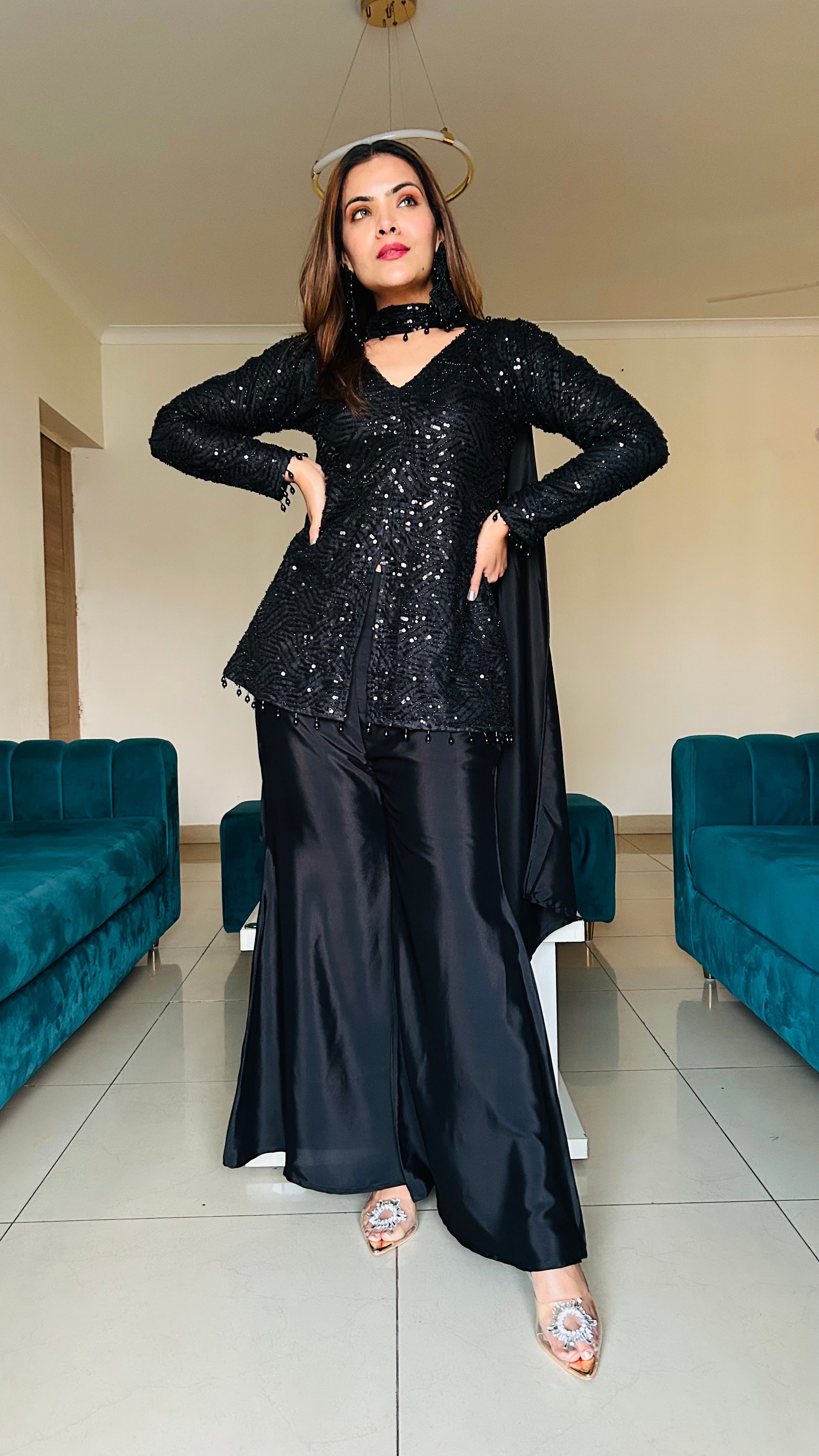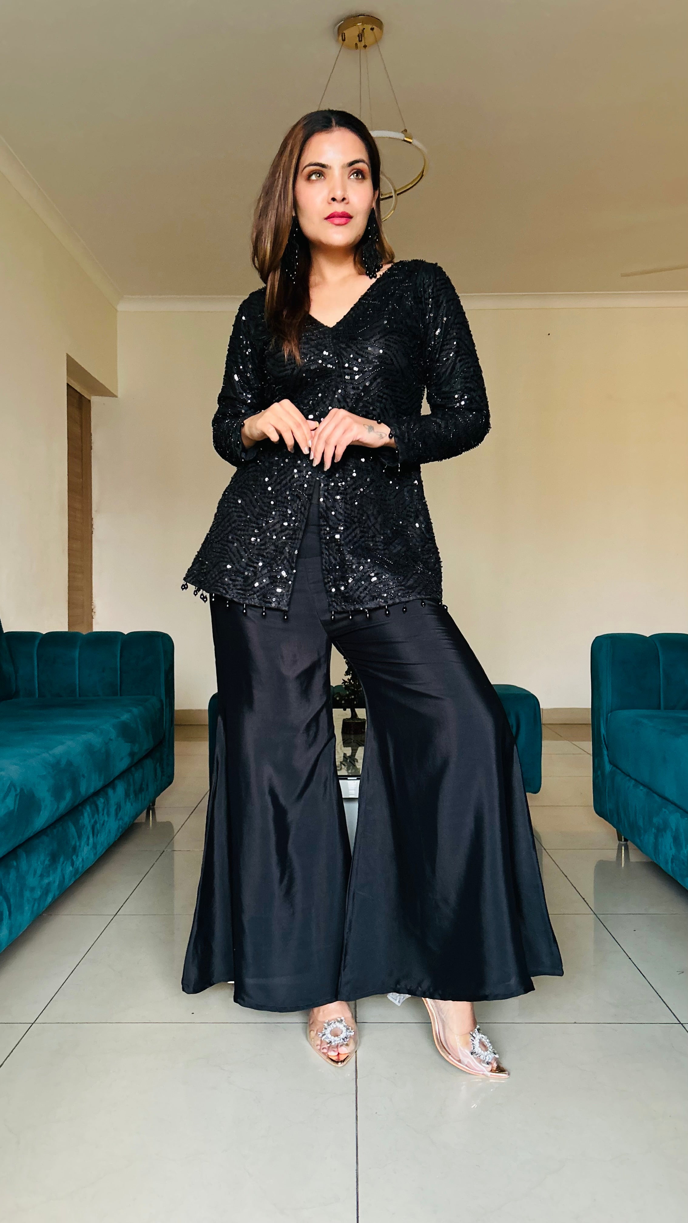 Partywear 3pc Co-ord set teamed up with trendy bell bottom palazzo in black Perfect cocktail /wedding & Eid outfits