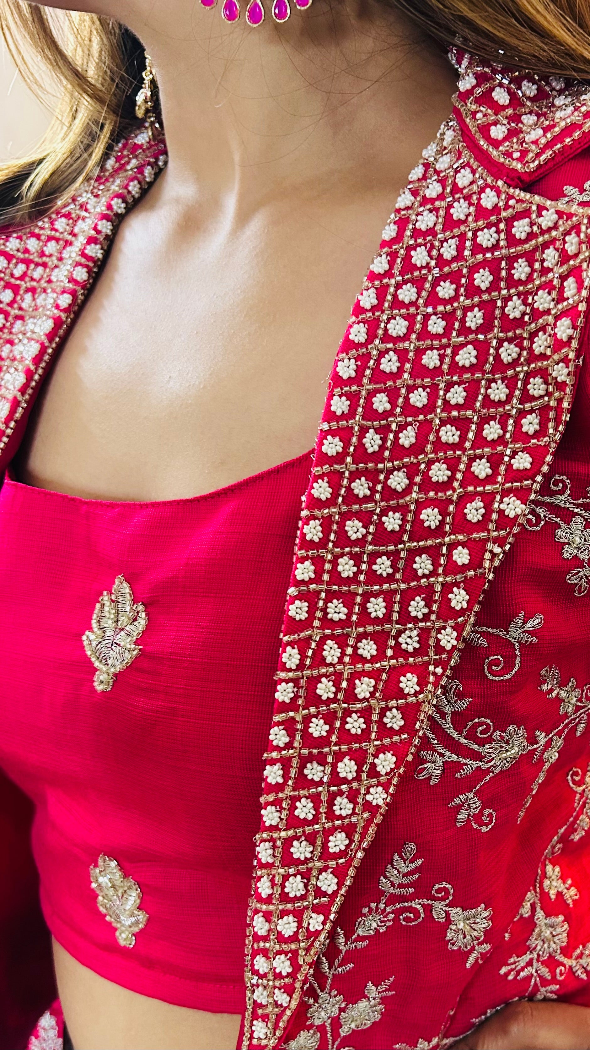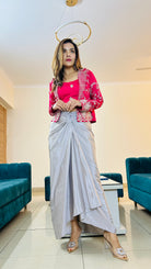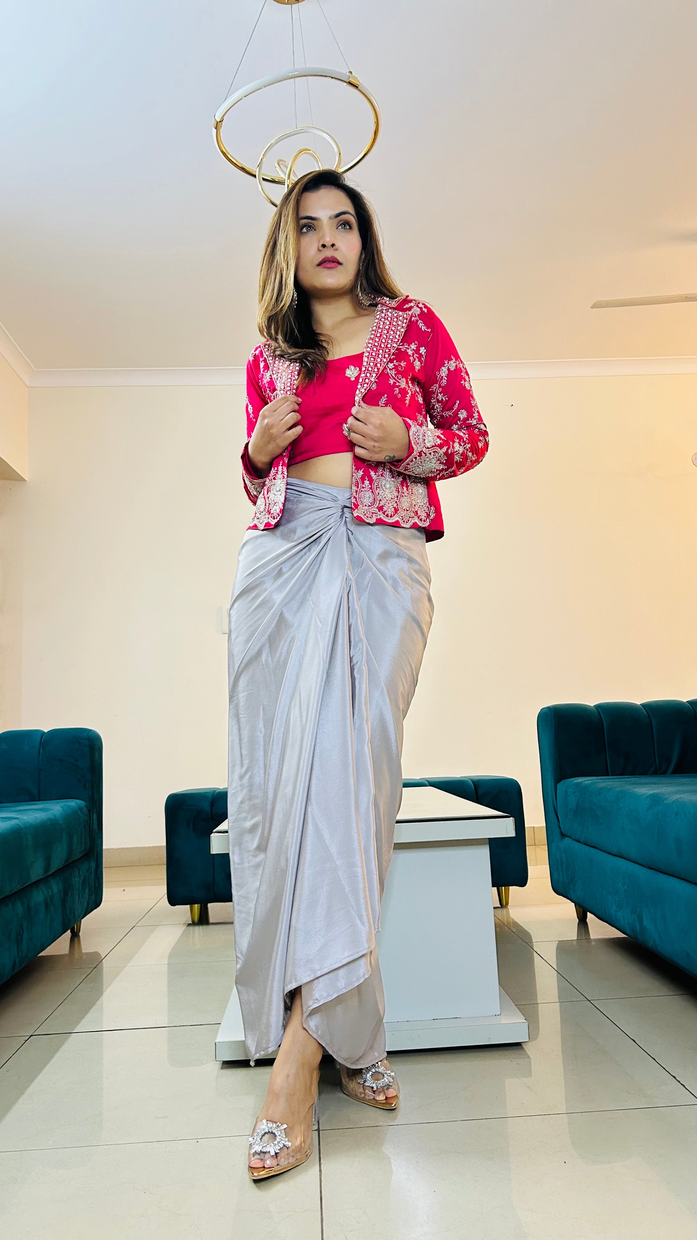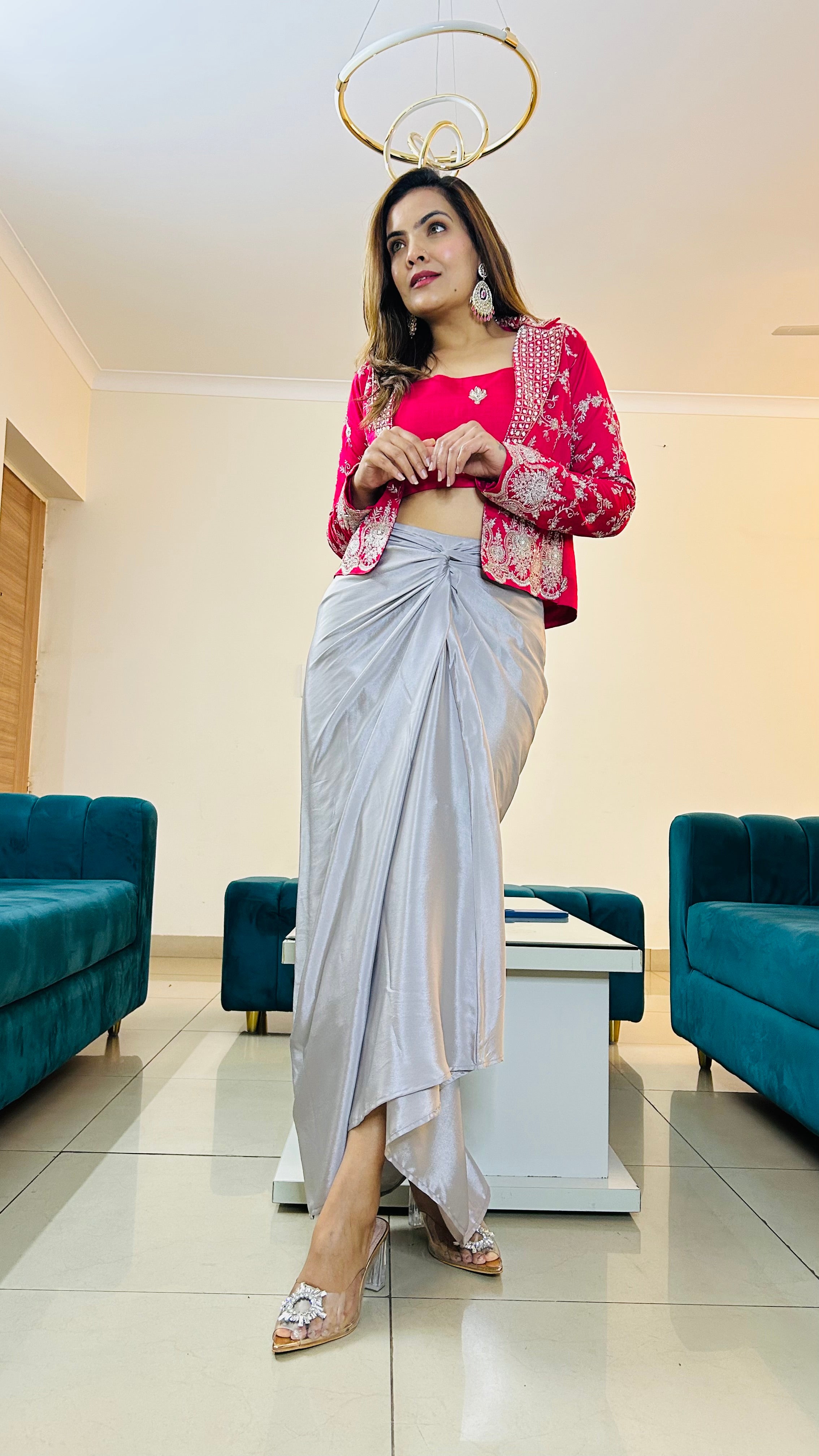 Supper trendy skirt jacket set for cocktail & weddings in blingy grey & rose red combination
