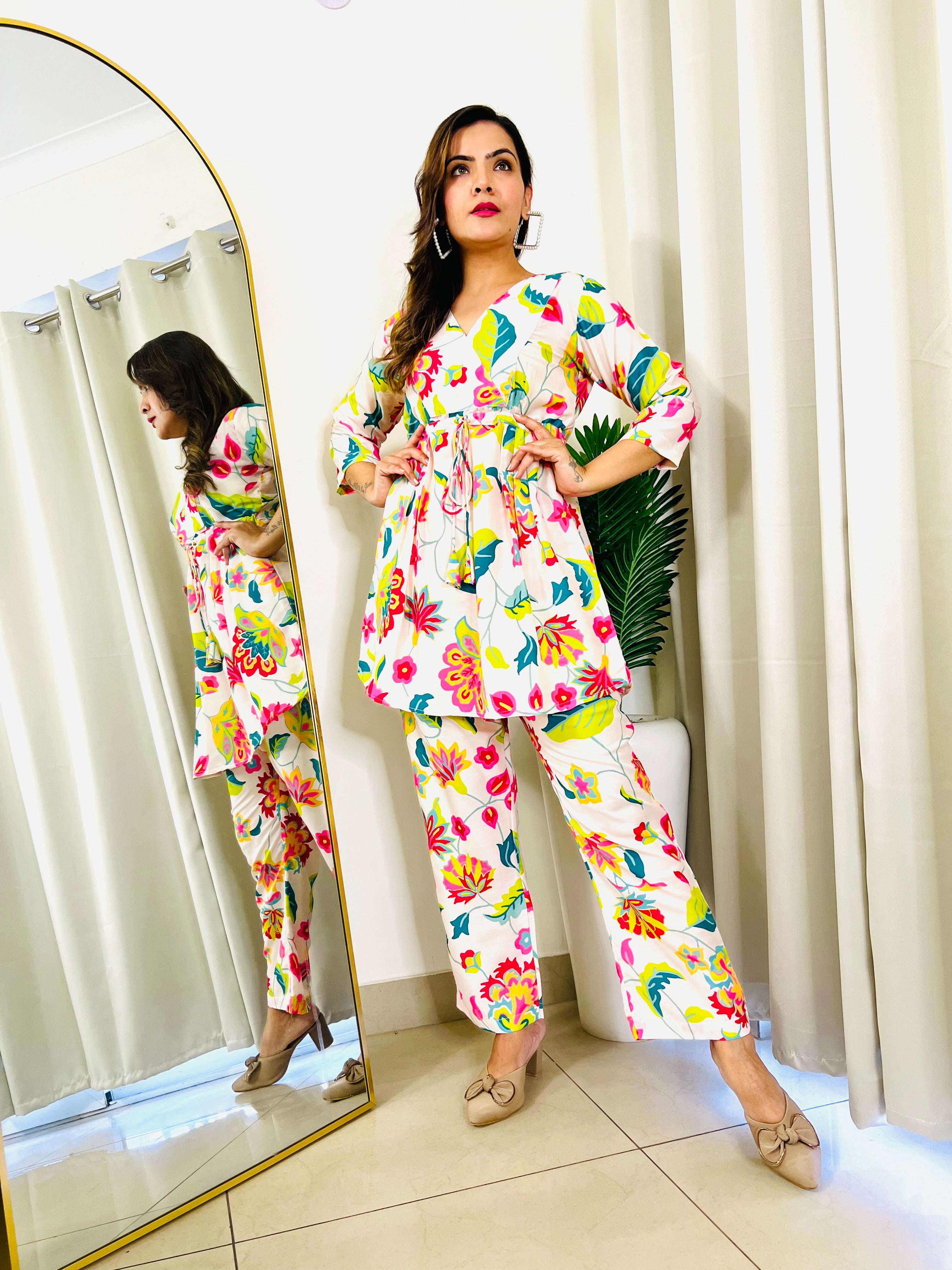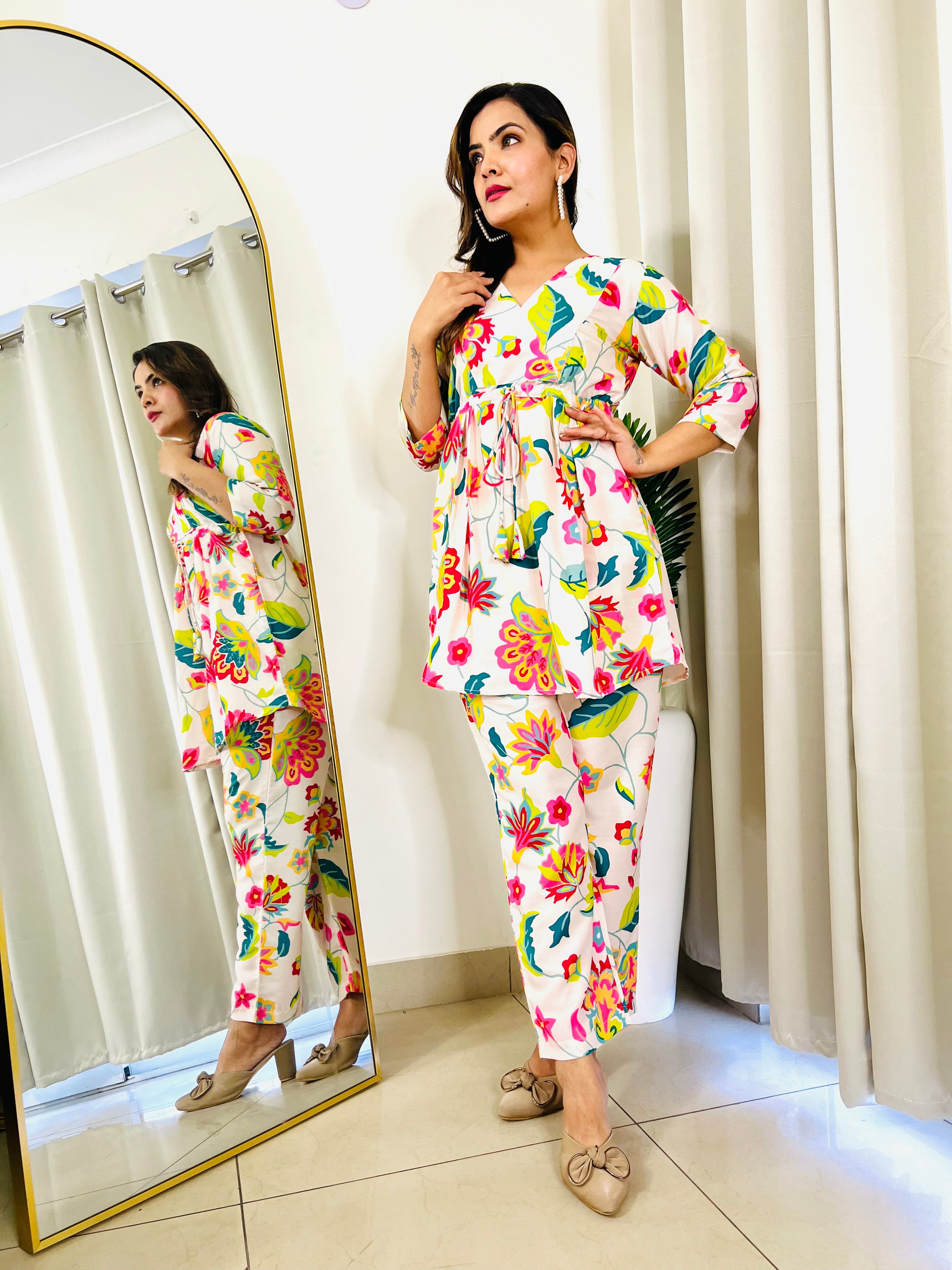Designer and vibrant,Light as air, soft as a dream, these breathable muslin fabric co-ords are your go-to for the season. Top length ⭐️Pant length2. 42-43”. 2. 37-38” DNo-863