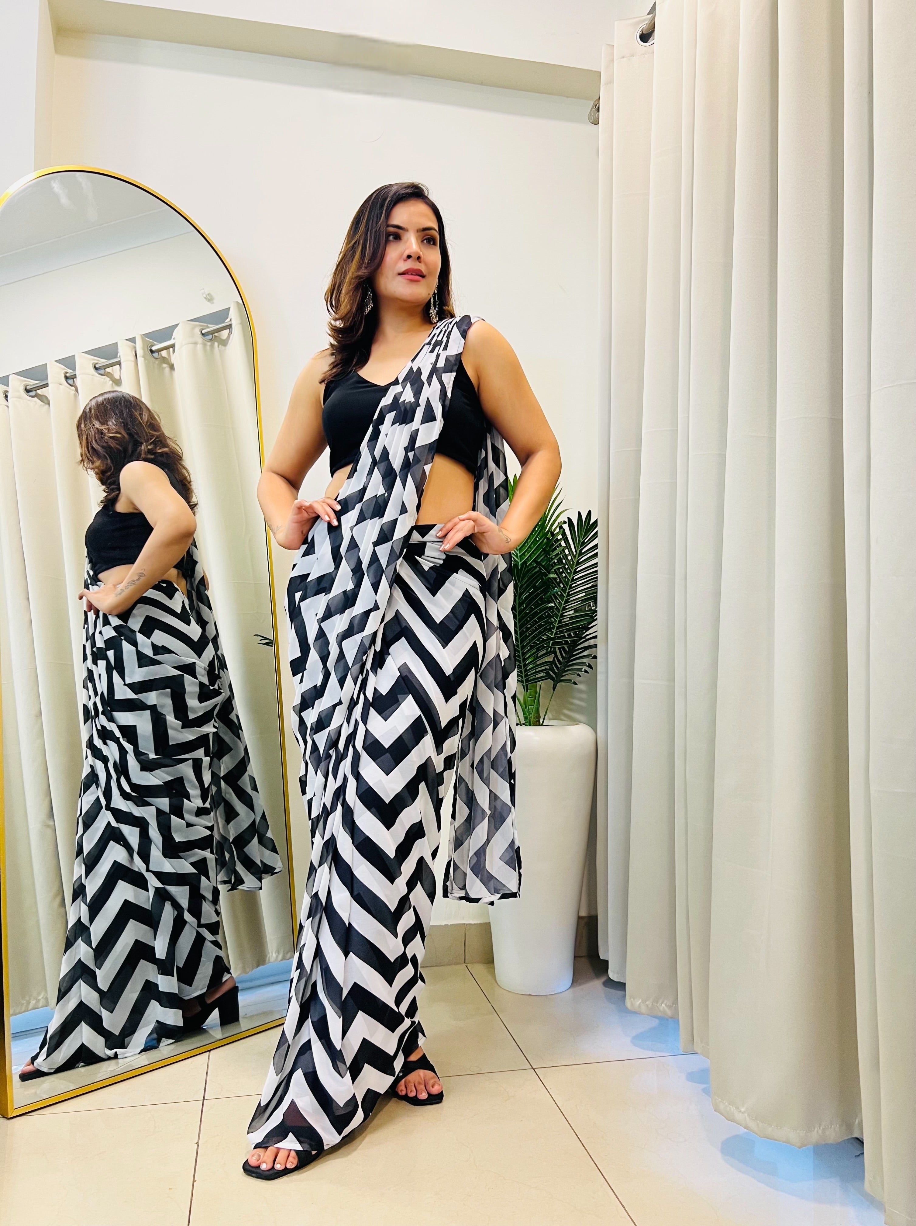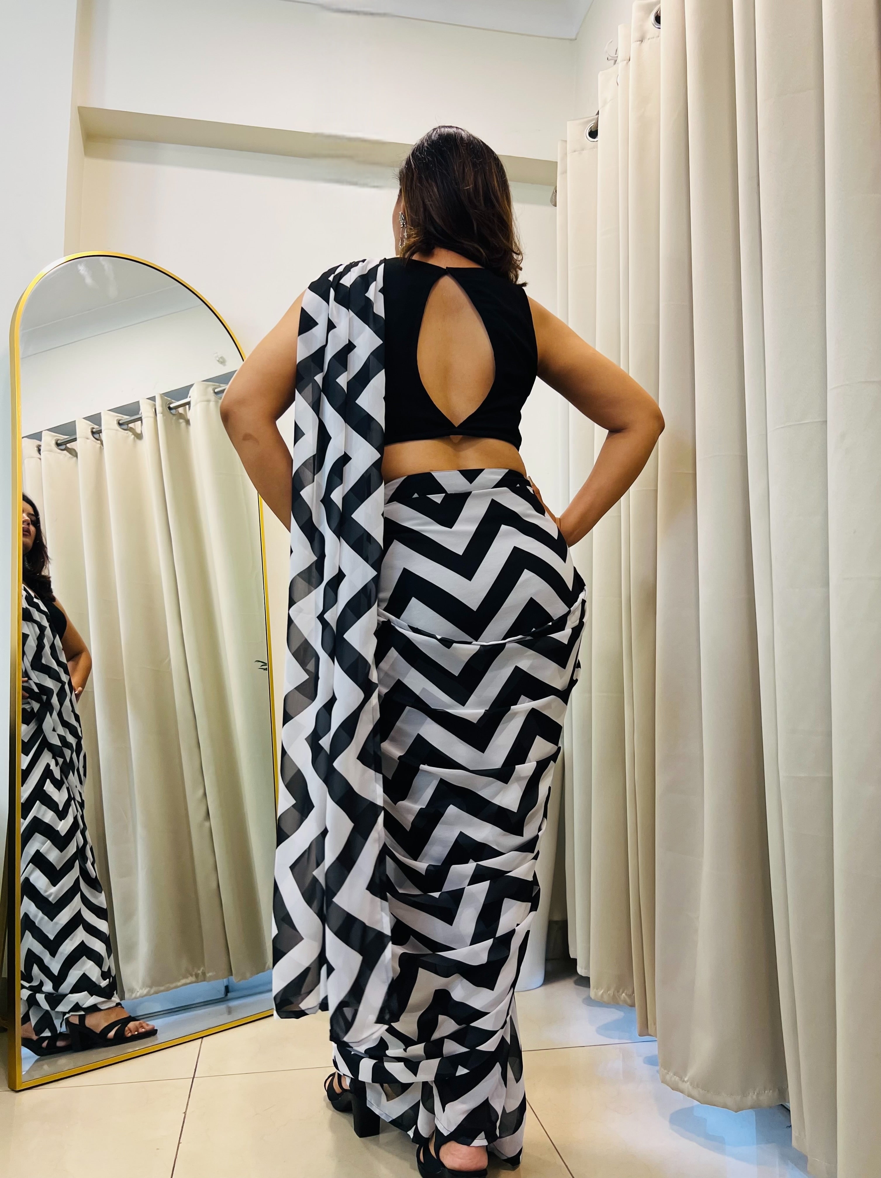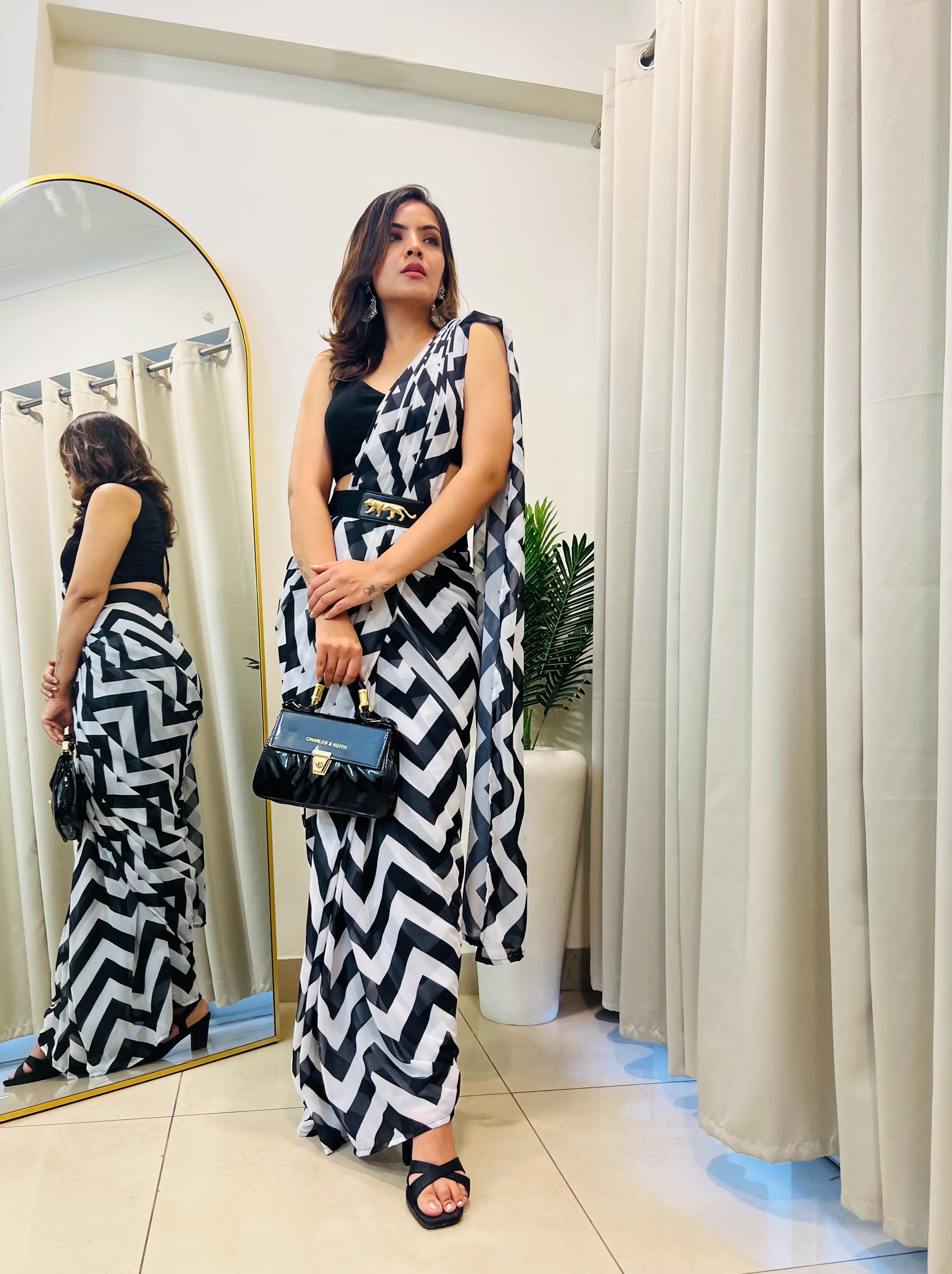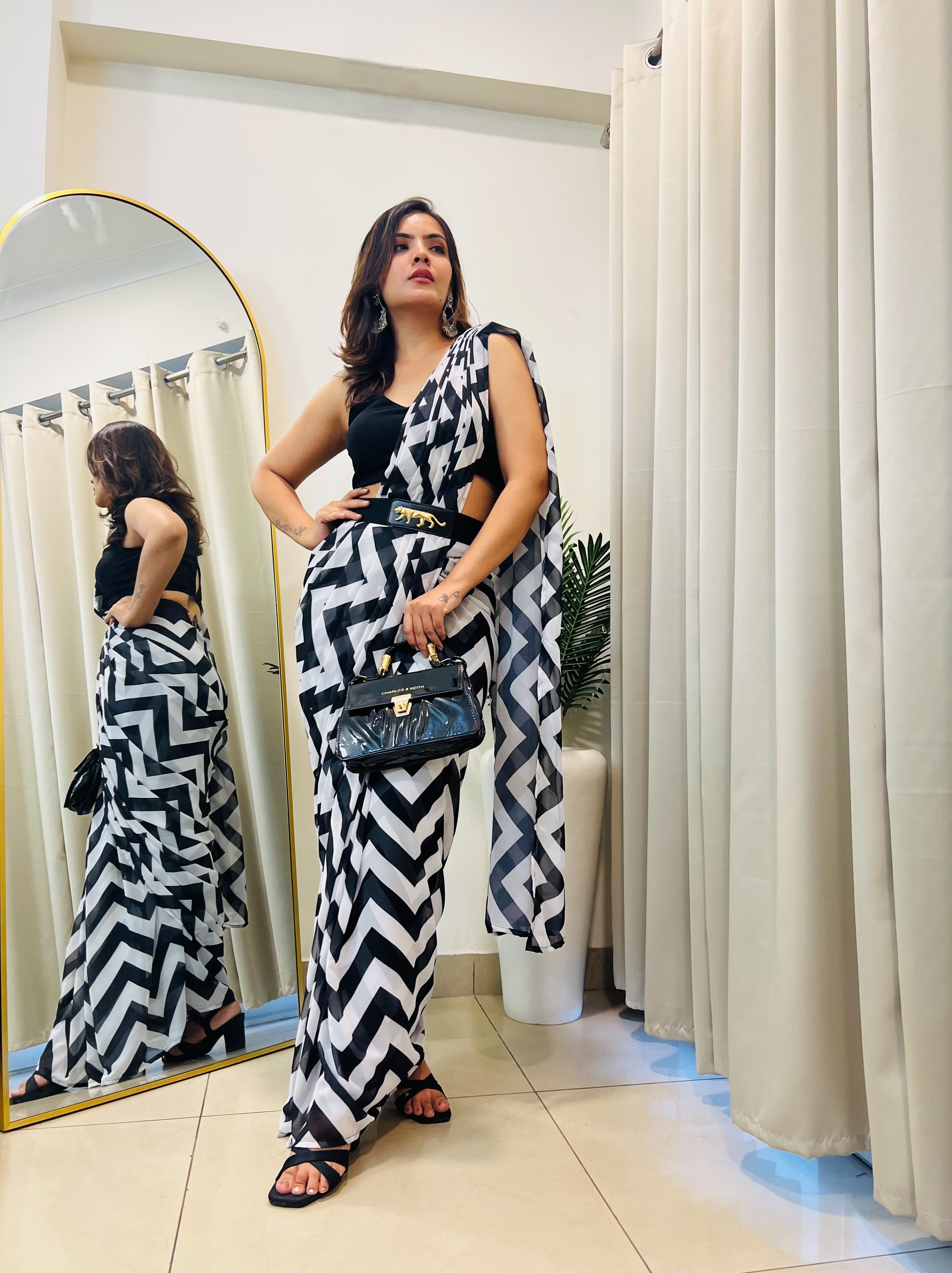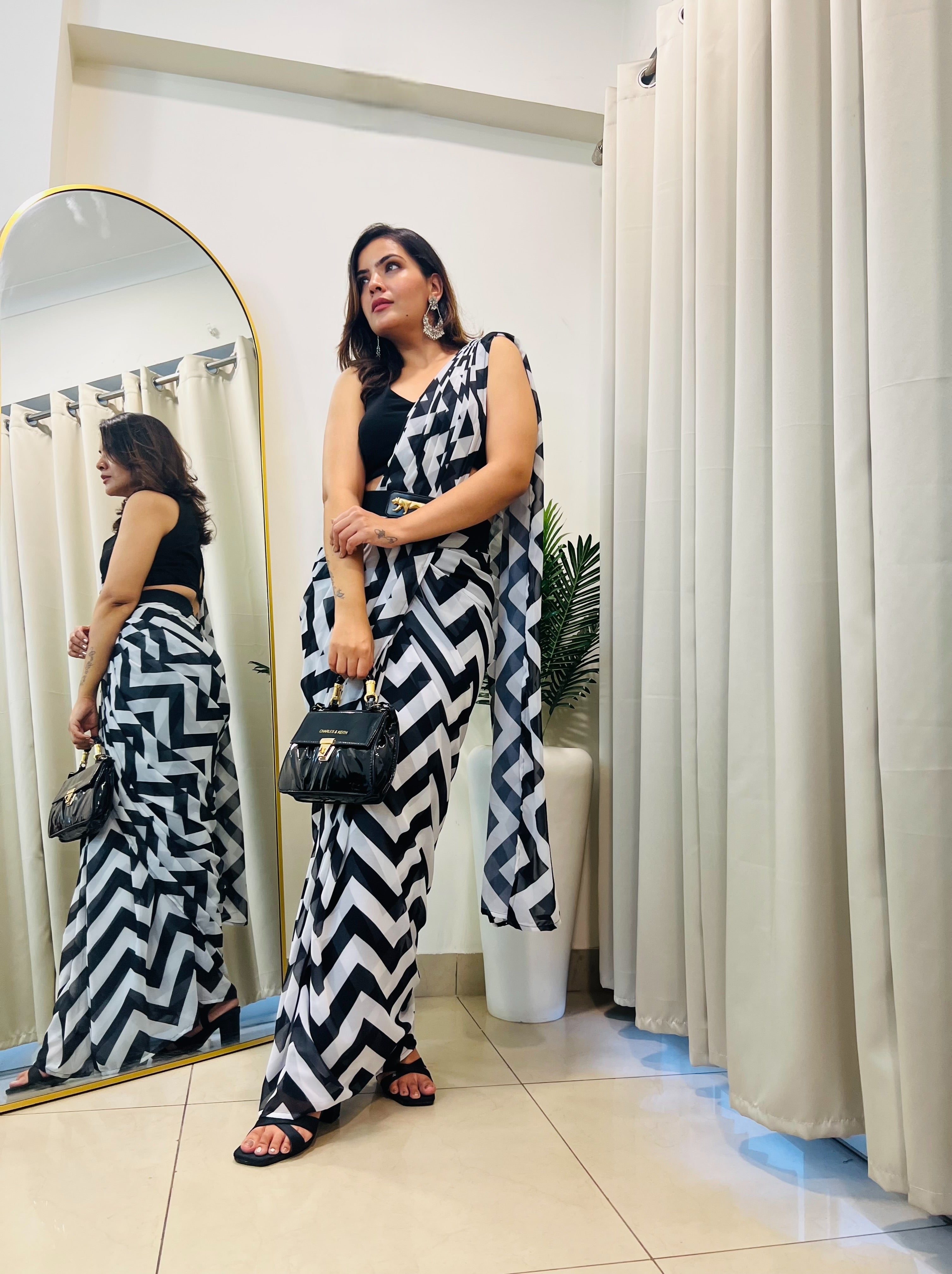 GET READY FOR THIS GLAMOROUS   READY TO WEAR BLACK  COCKTAIL PRE-DRAPED SAREE TO SLAY THIS SEASON