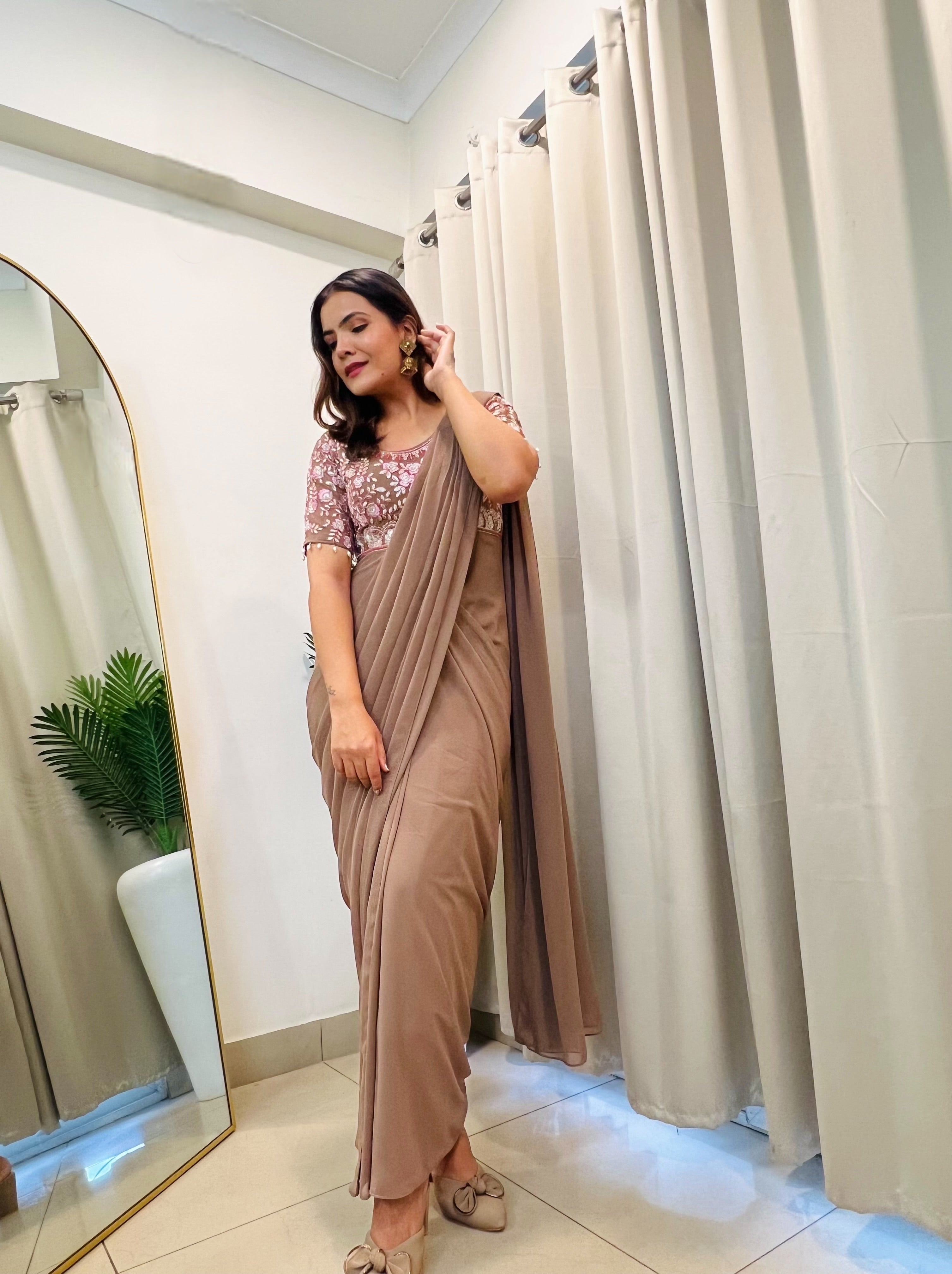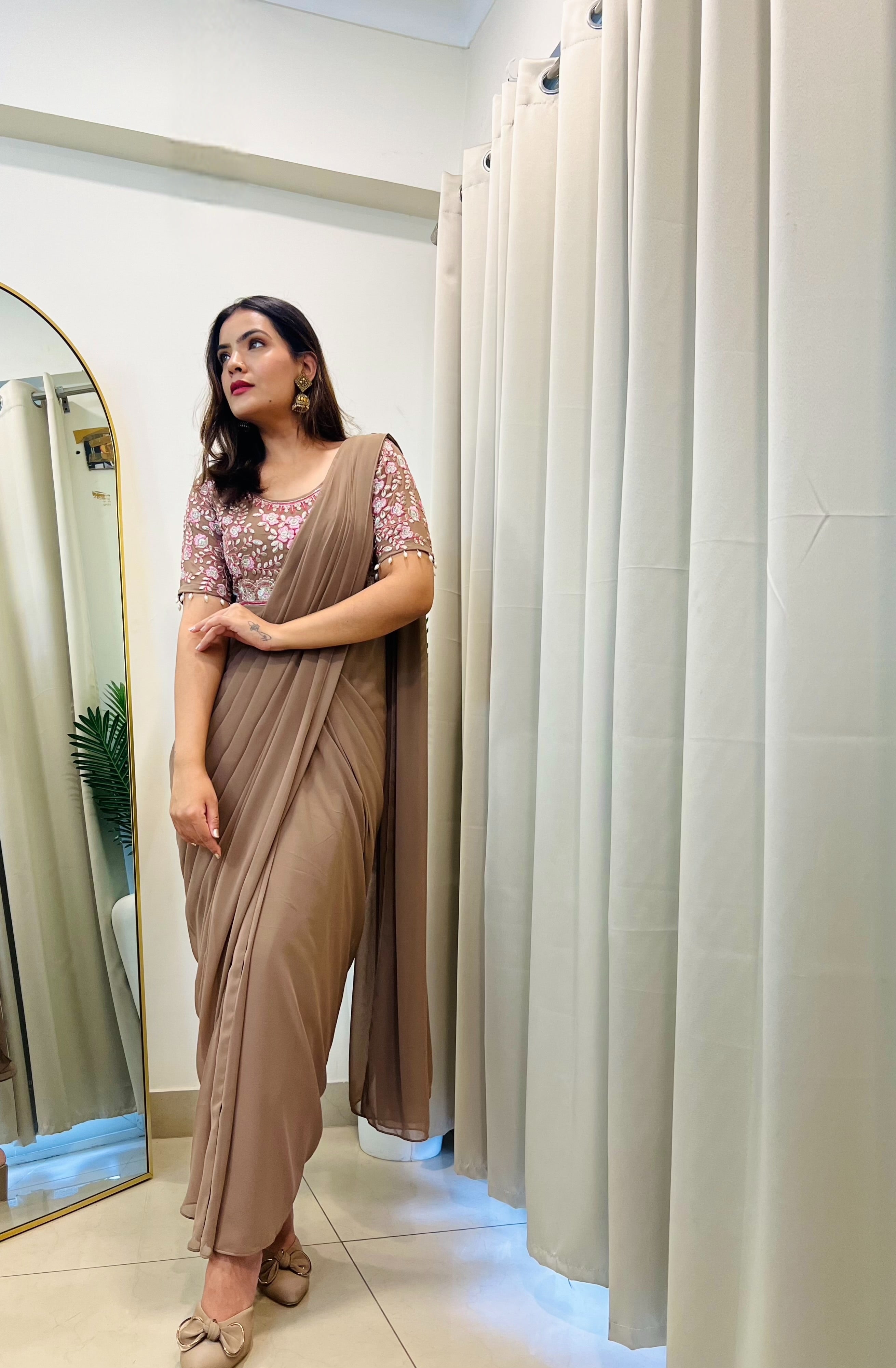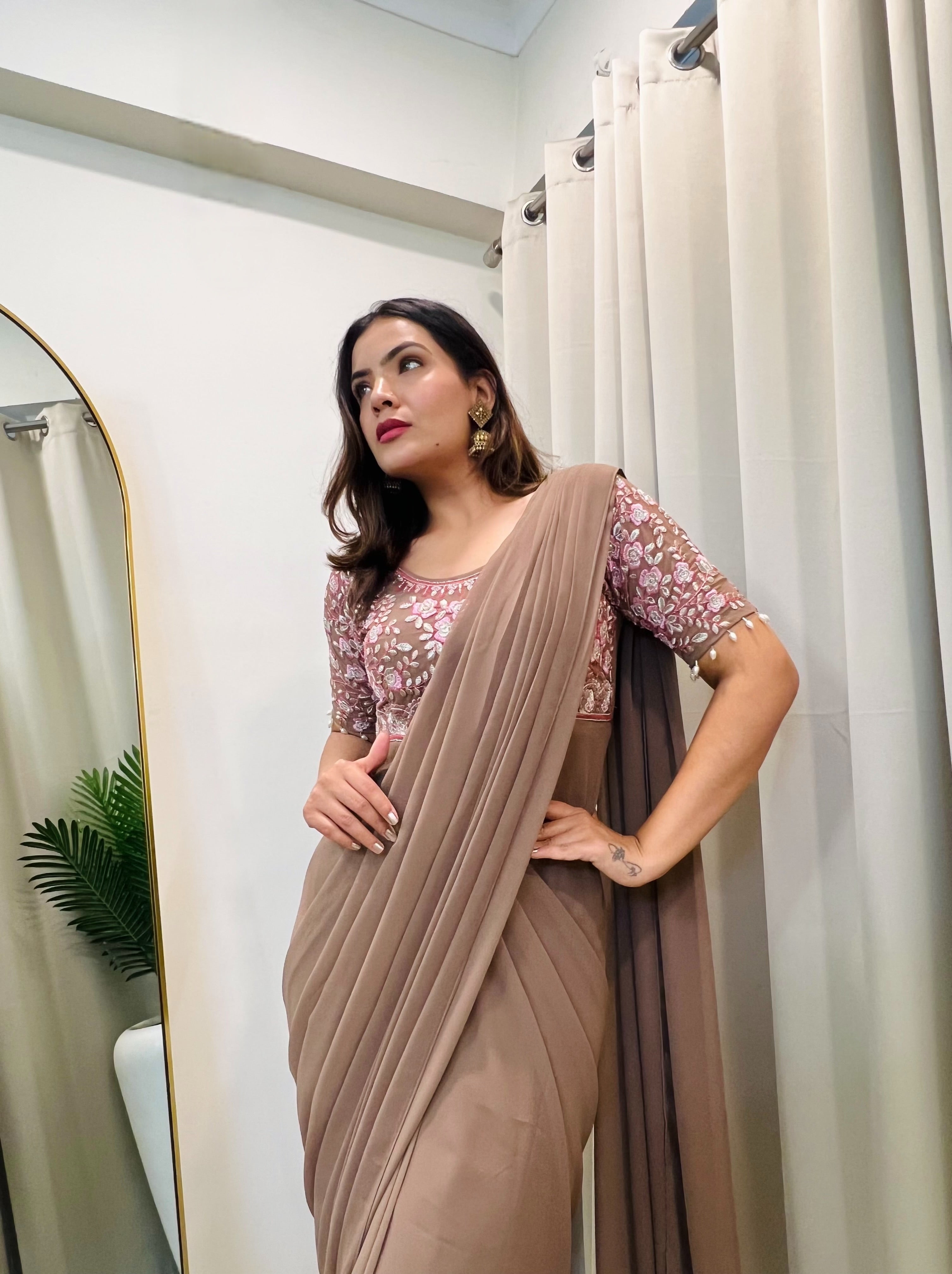 Designer Elegant Nude Brown Saree with Pink Floral Embroidered Blouse –for cocktail Party & Wedding