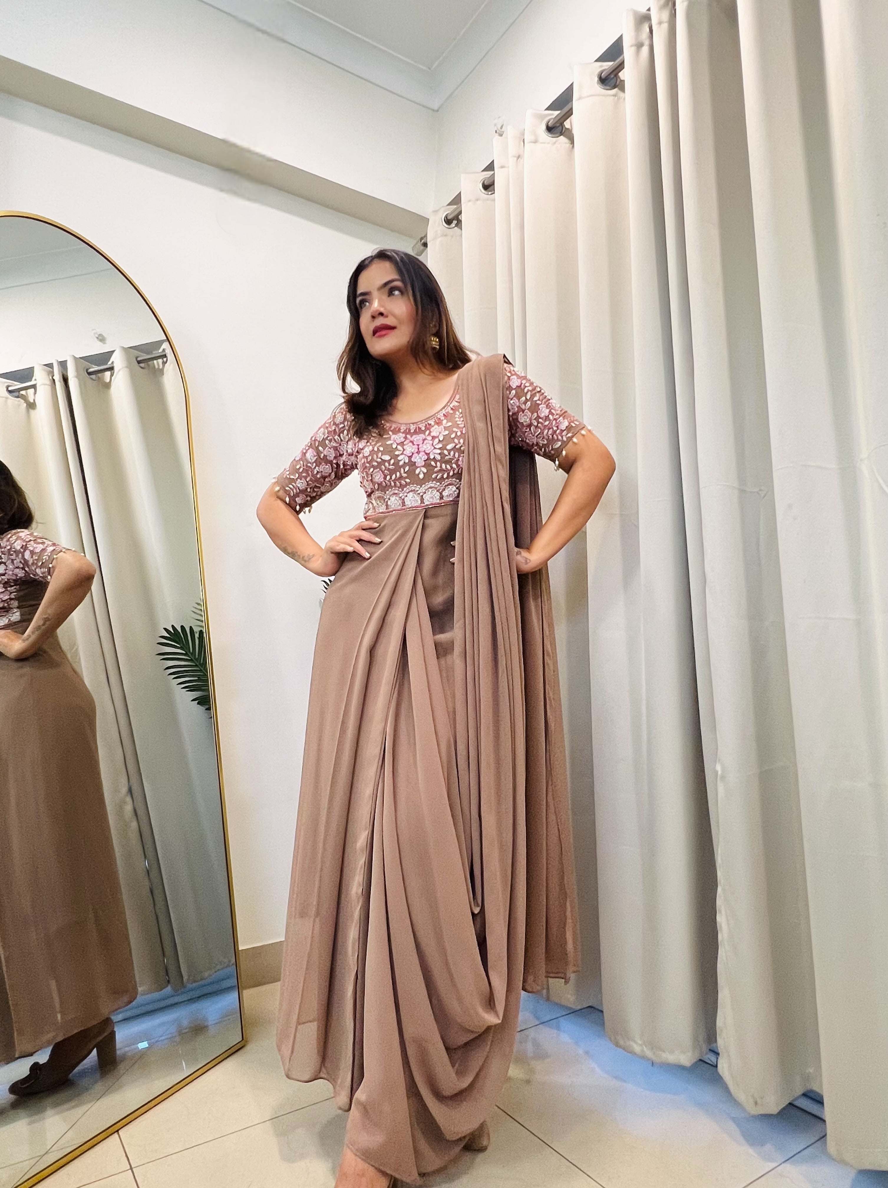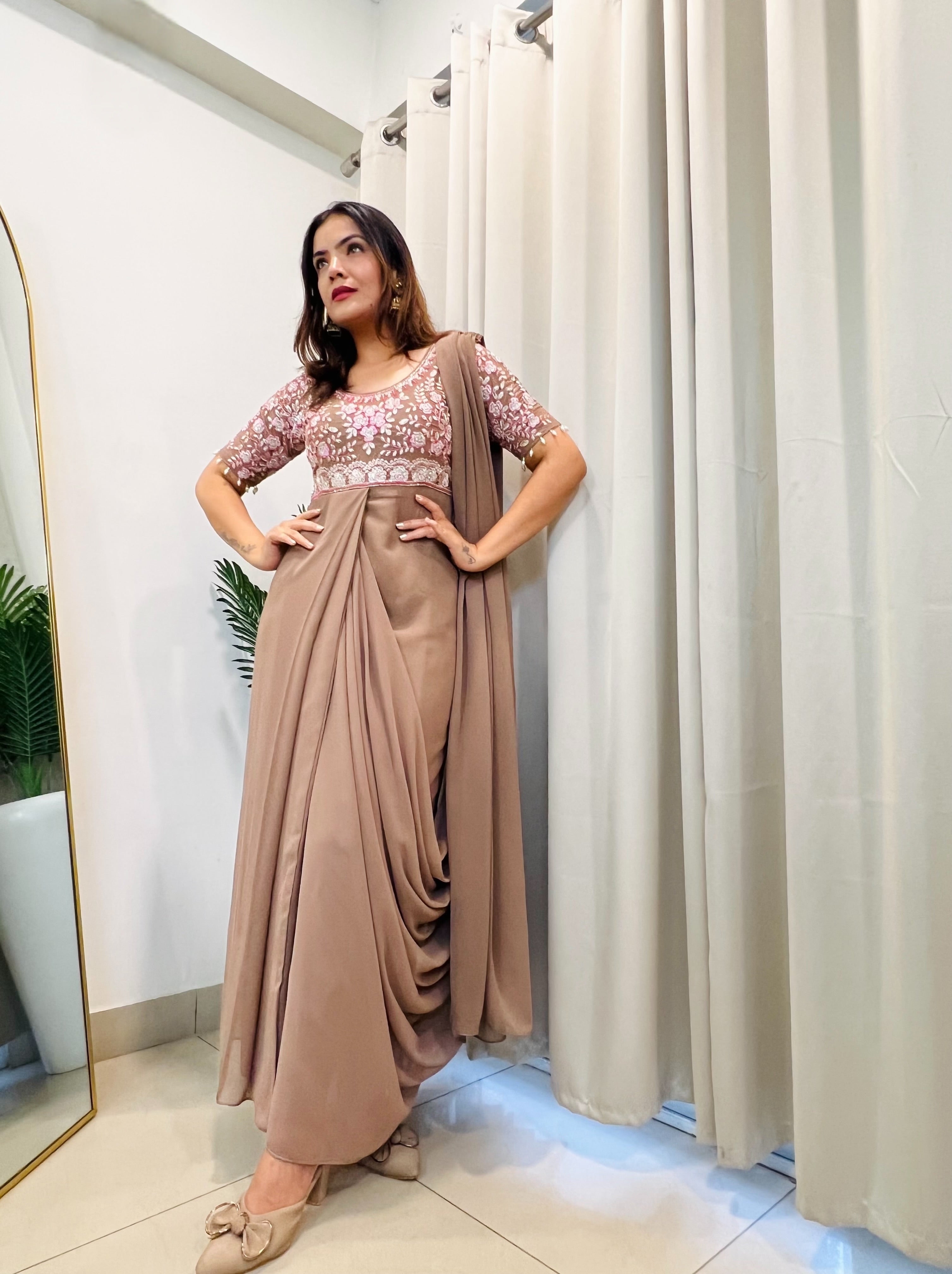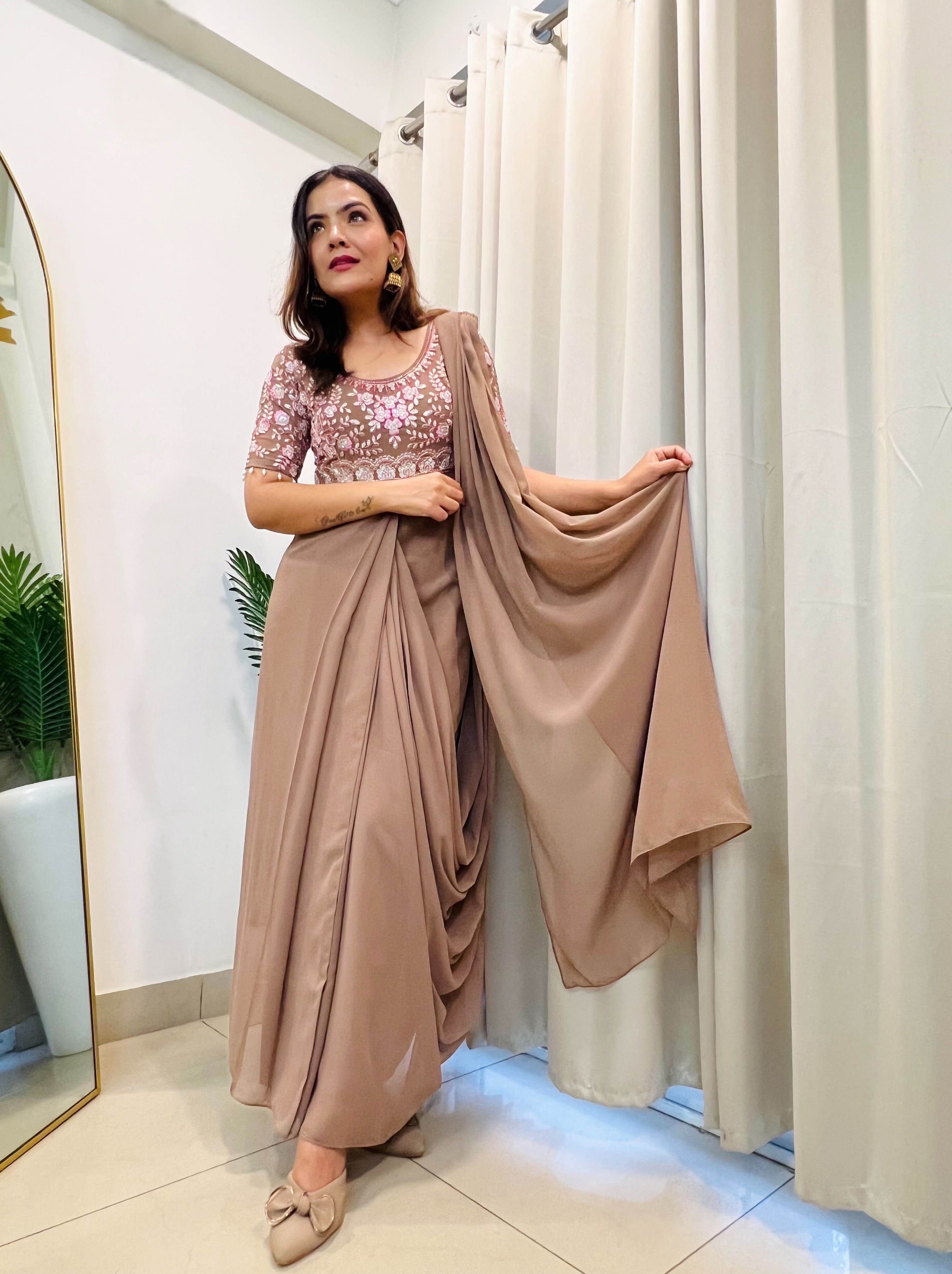 Designer Elegant Nude Brown Saree with Pink Floral Embroidered Blouse –for cocktail Party & Wedding