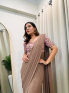 Shop this stunning nude brown saree paired with a pink floral embroidered blouse. Perfect for parties, weddings, and festive occasions. Crafted in soft fabric for comfort and elegance, this saree is a must-have for your ethnic wear collection. Available now in all sizes.
