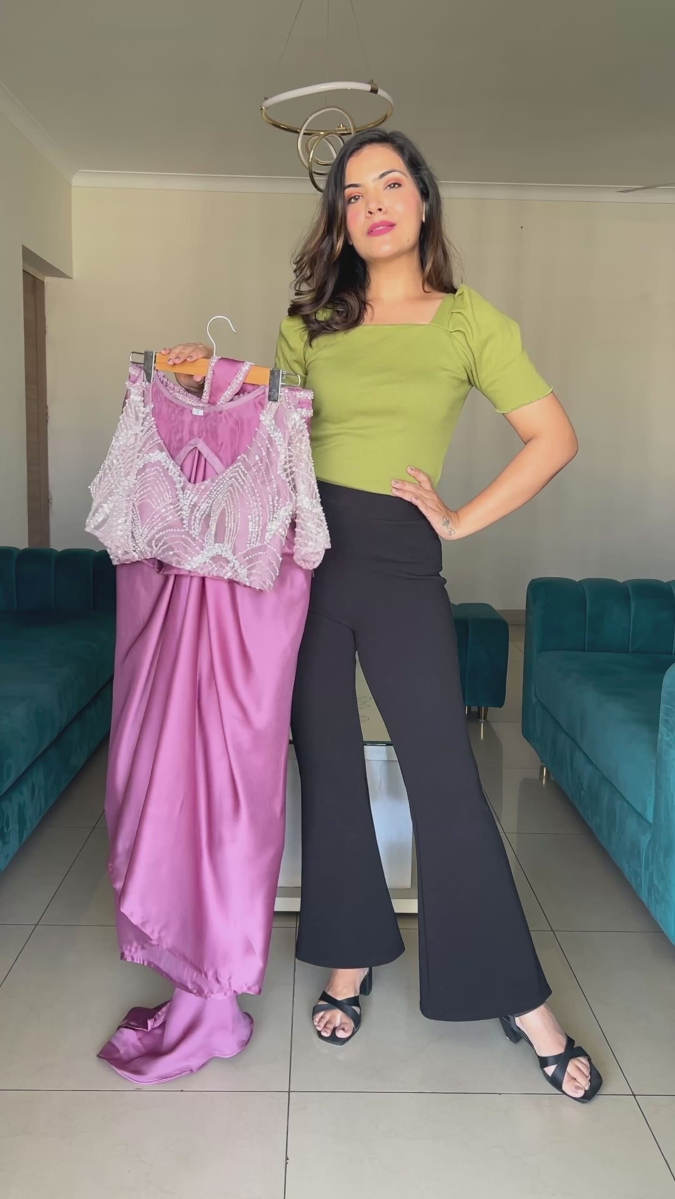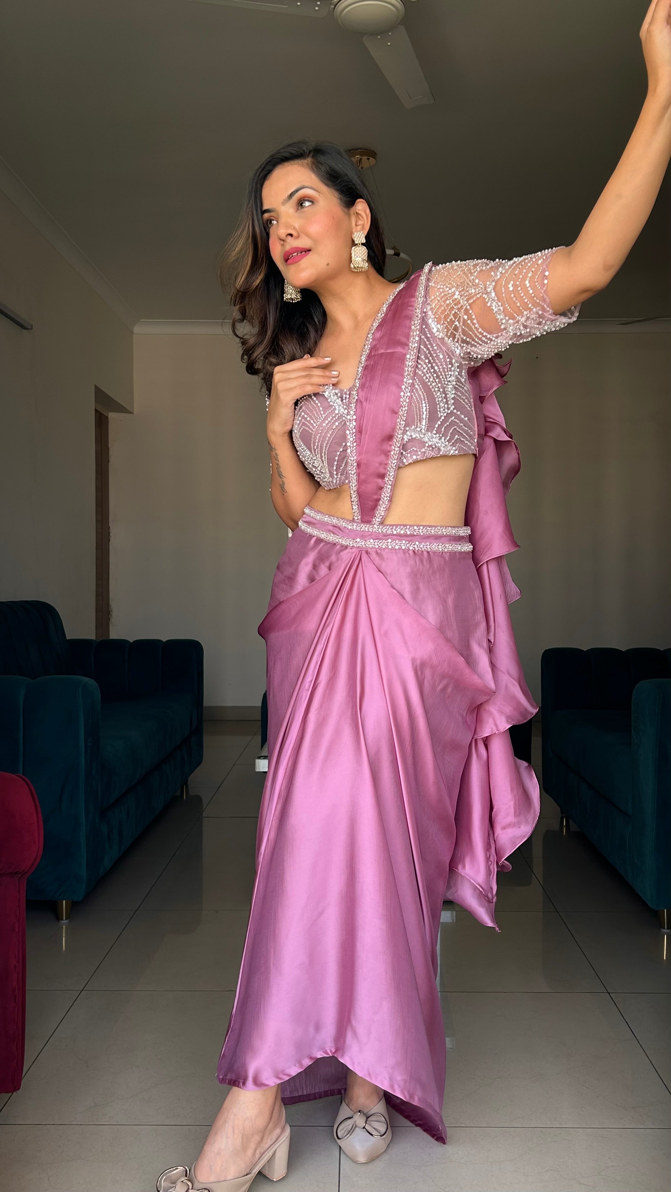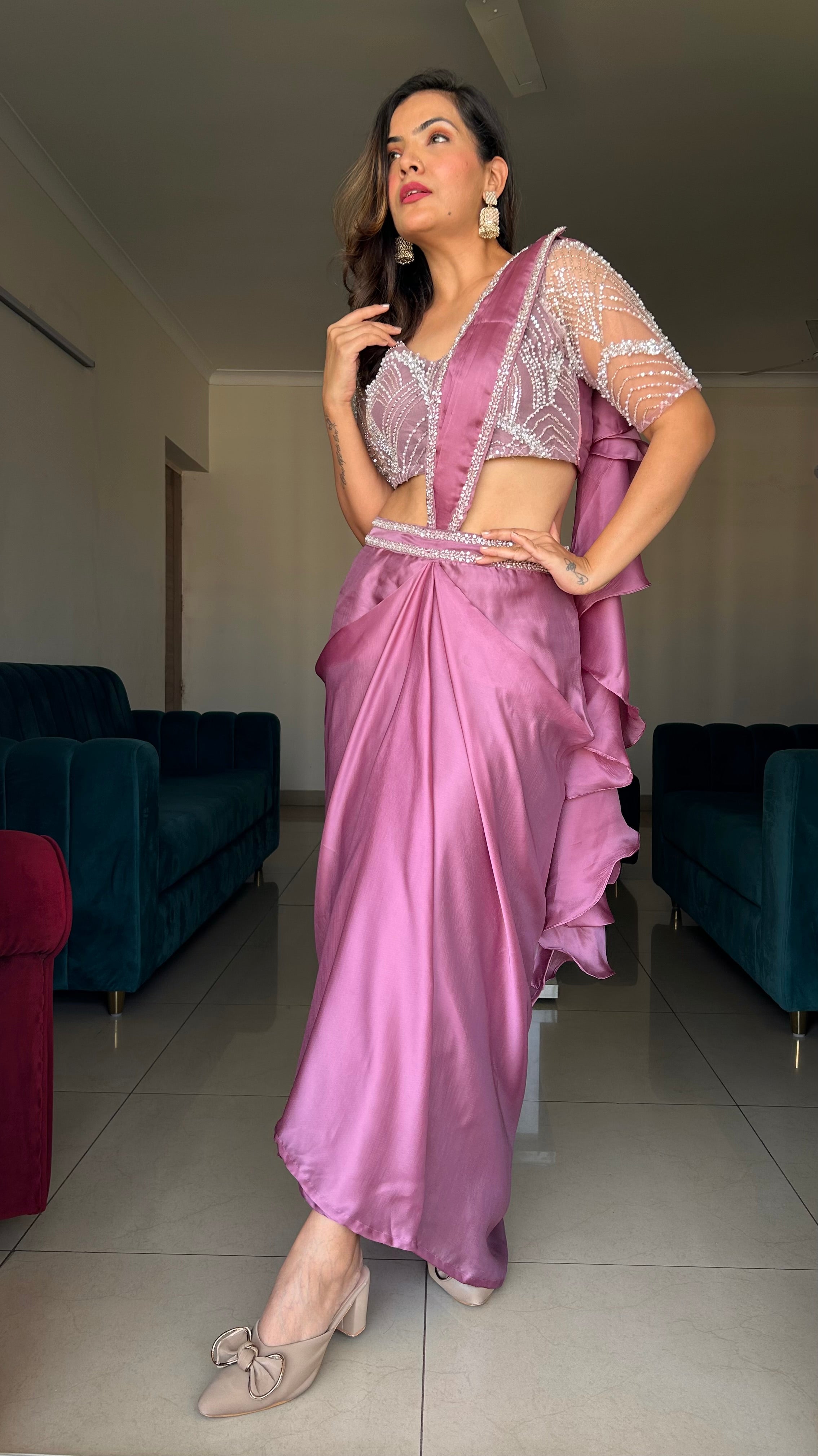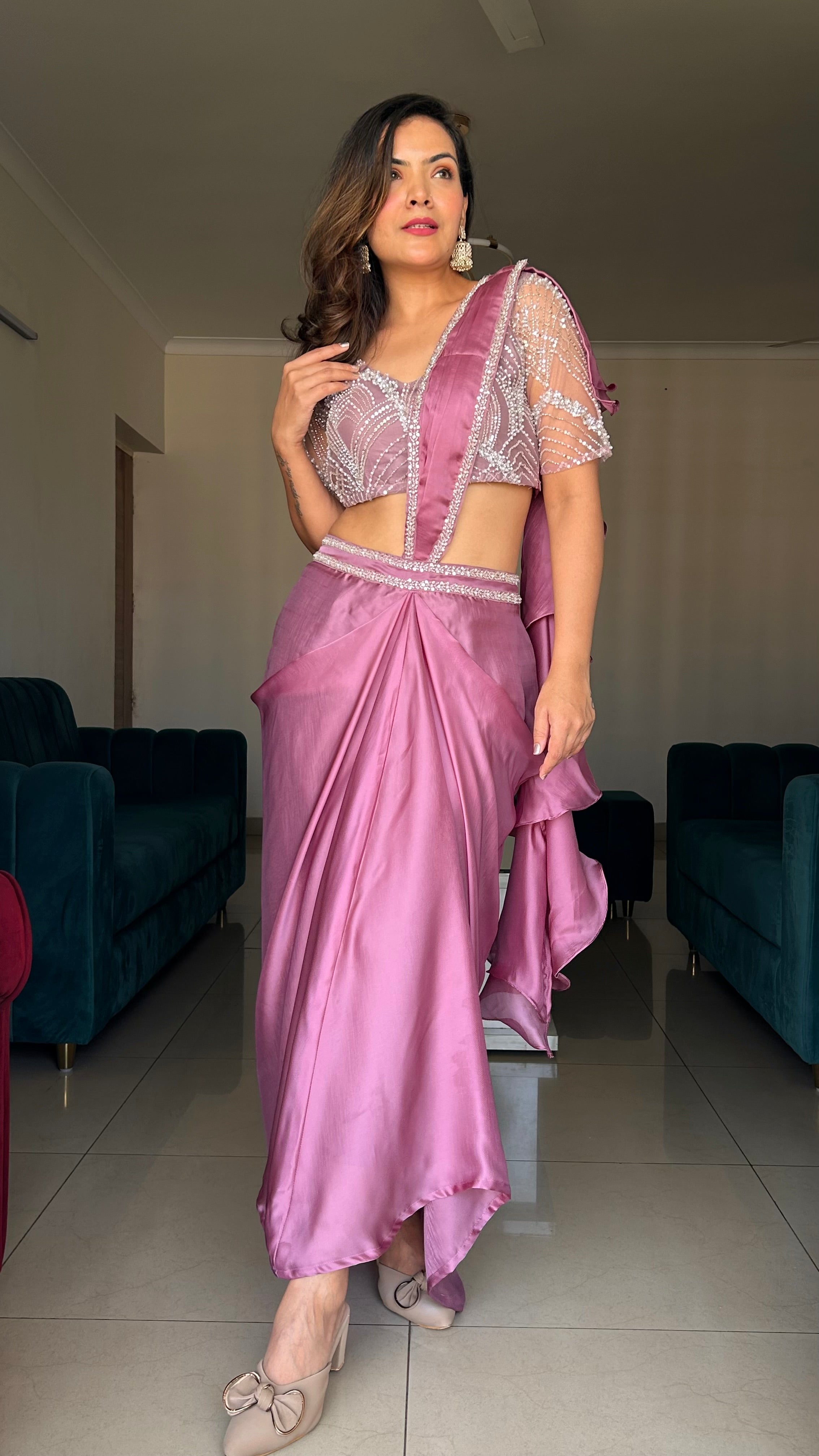 Turn heads in this stunning mauve satin pre-draped saree featuring a hand-embroidered beaded blouse with sheer sleeves and a modern silhouette. Perfect for weddings, festive events, and parties, this ready-to-wear saree blends traditional grace with contemporary charm. Crafted from premium satin with intricate pearl and sequin detailing, this designer saree by RK Kurtis ensures effortless elegance and comfort.