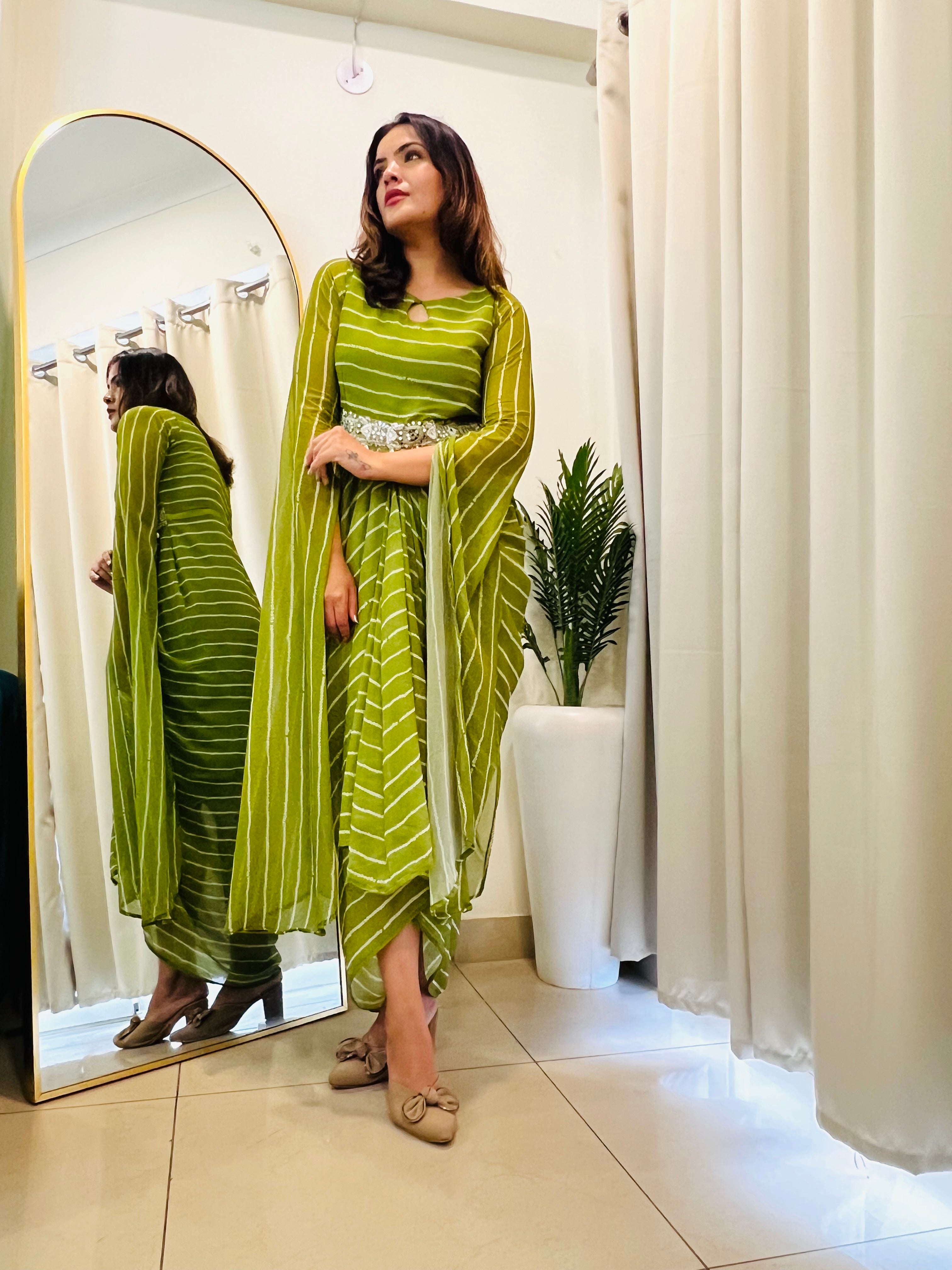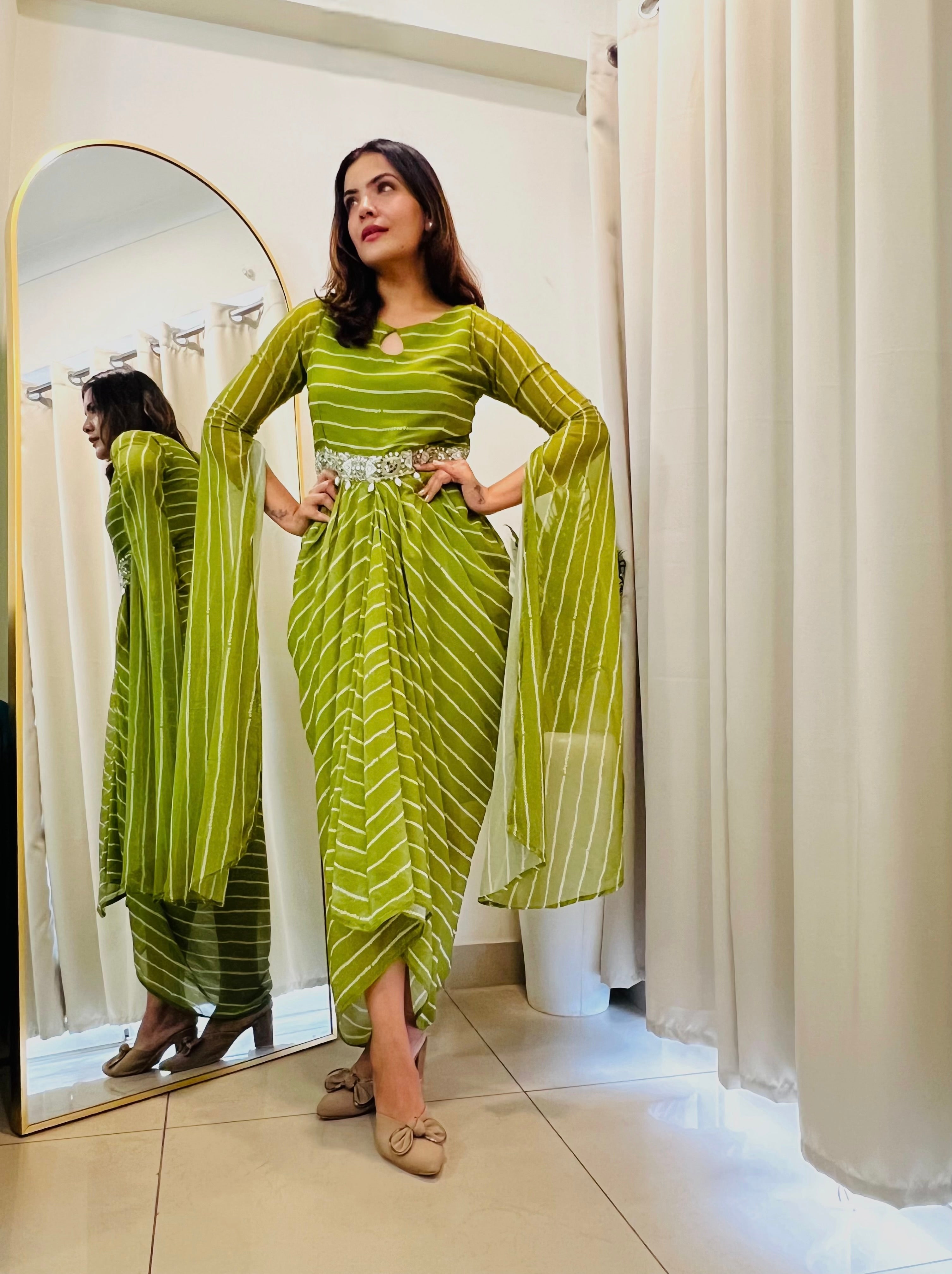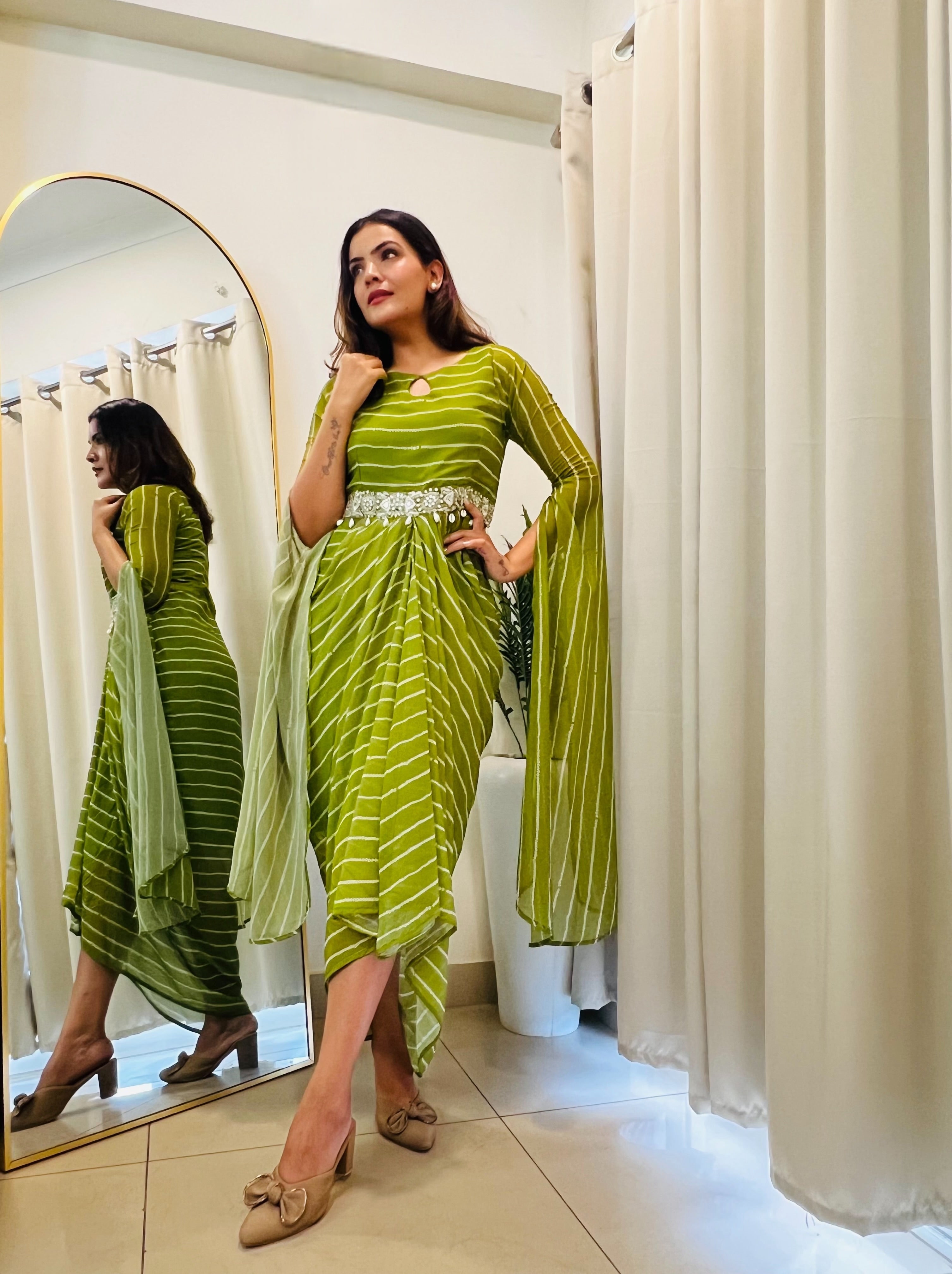 Perfect Rakhi outfit “ Indowestern one pc drape style dress in green leheriya pattern” for women