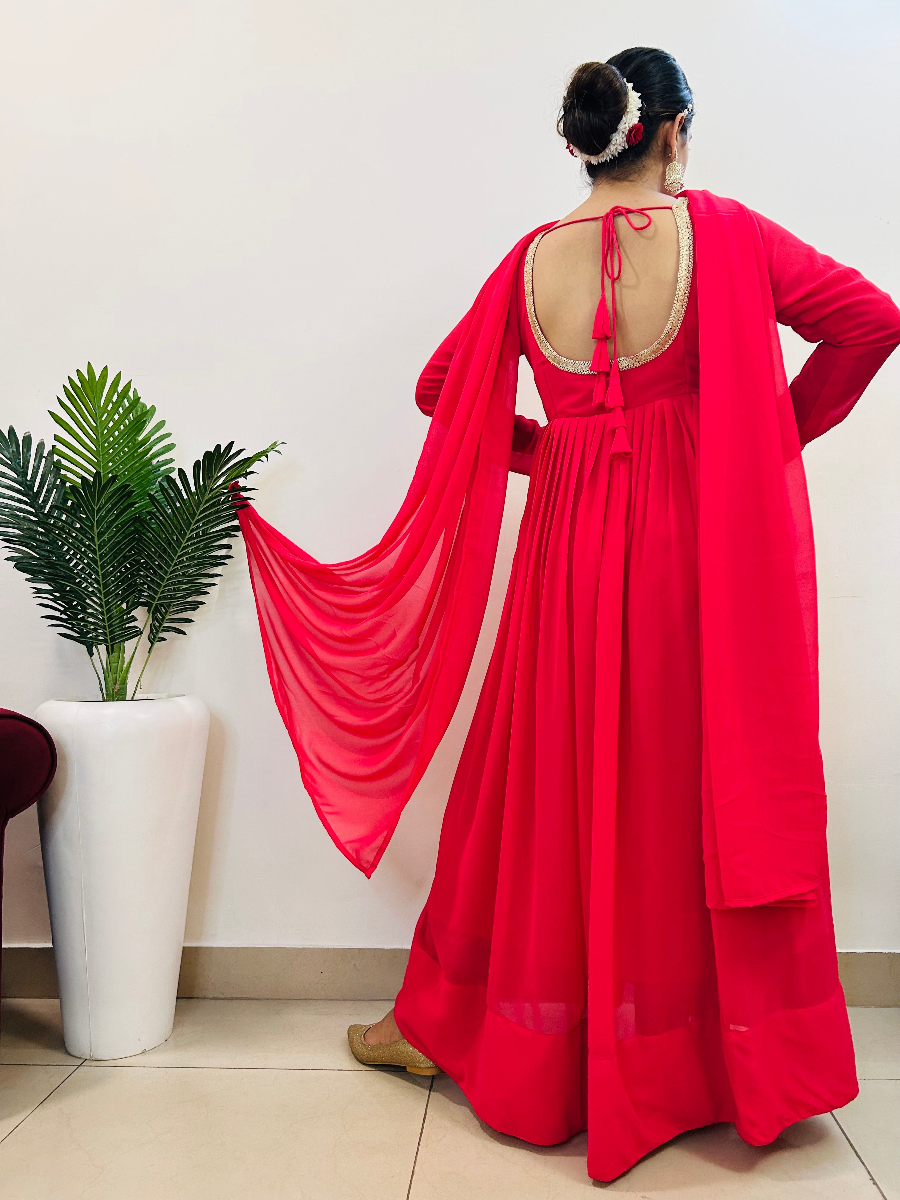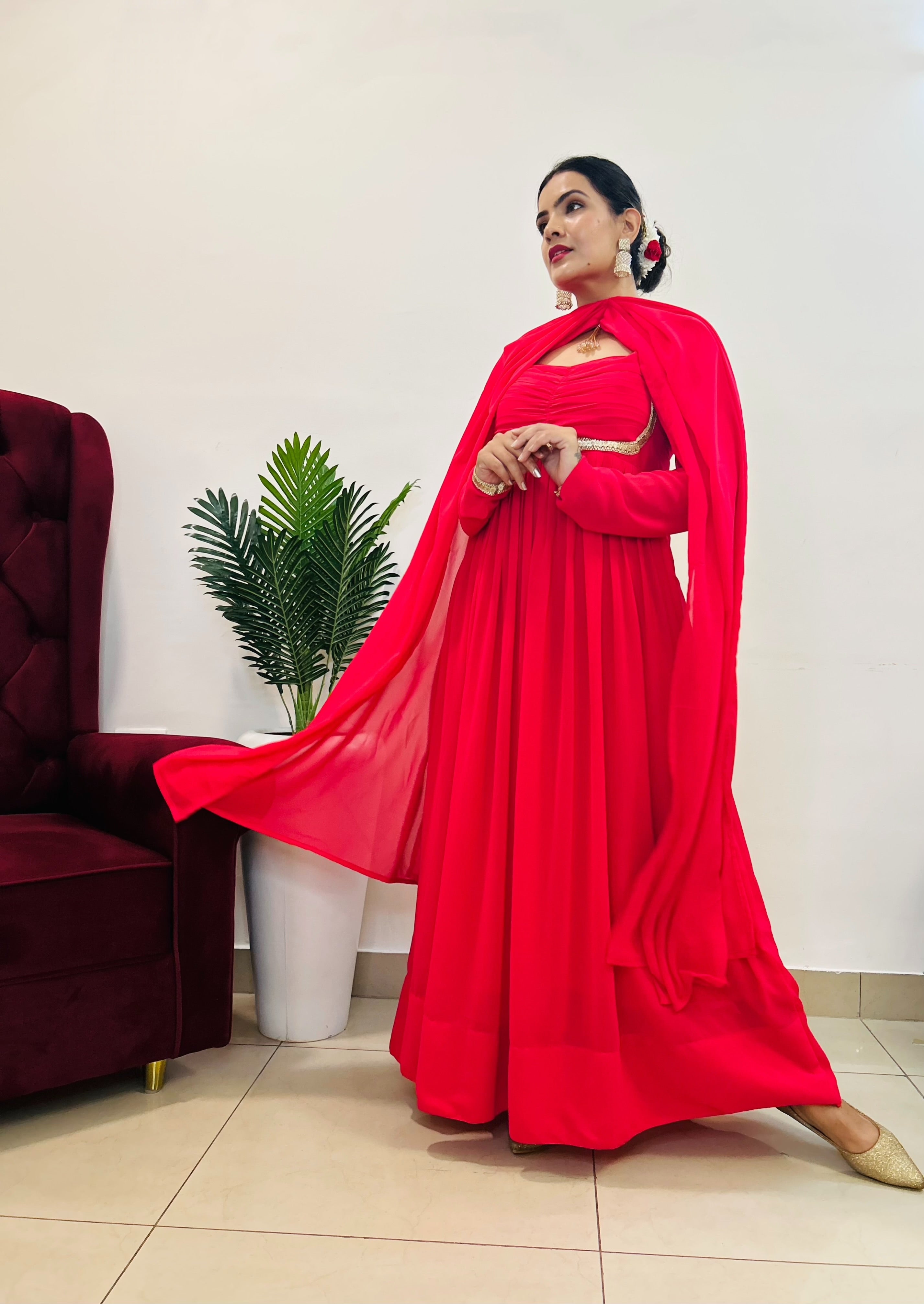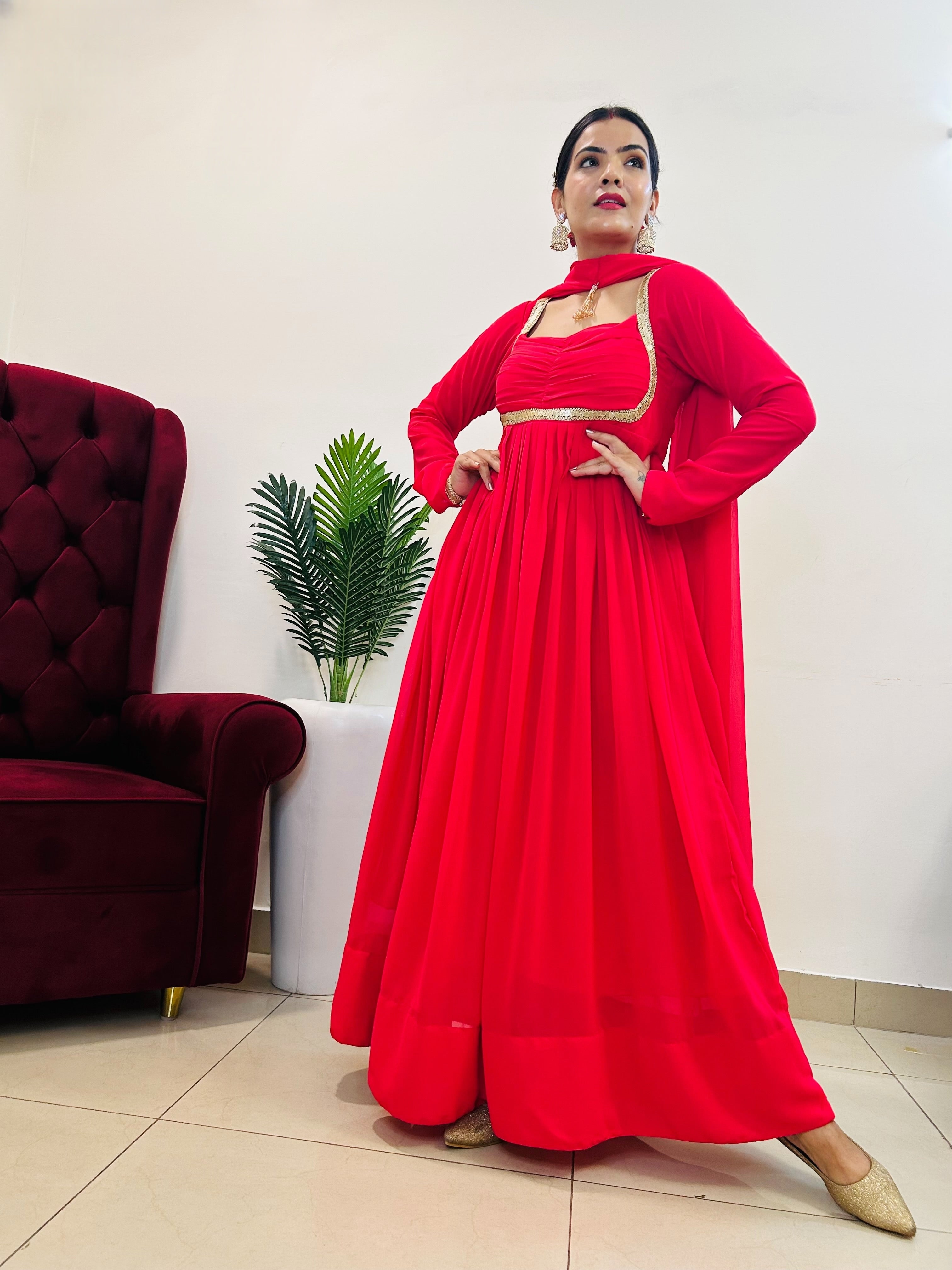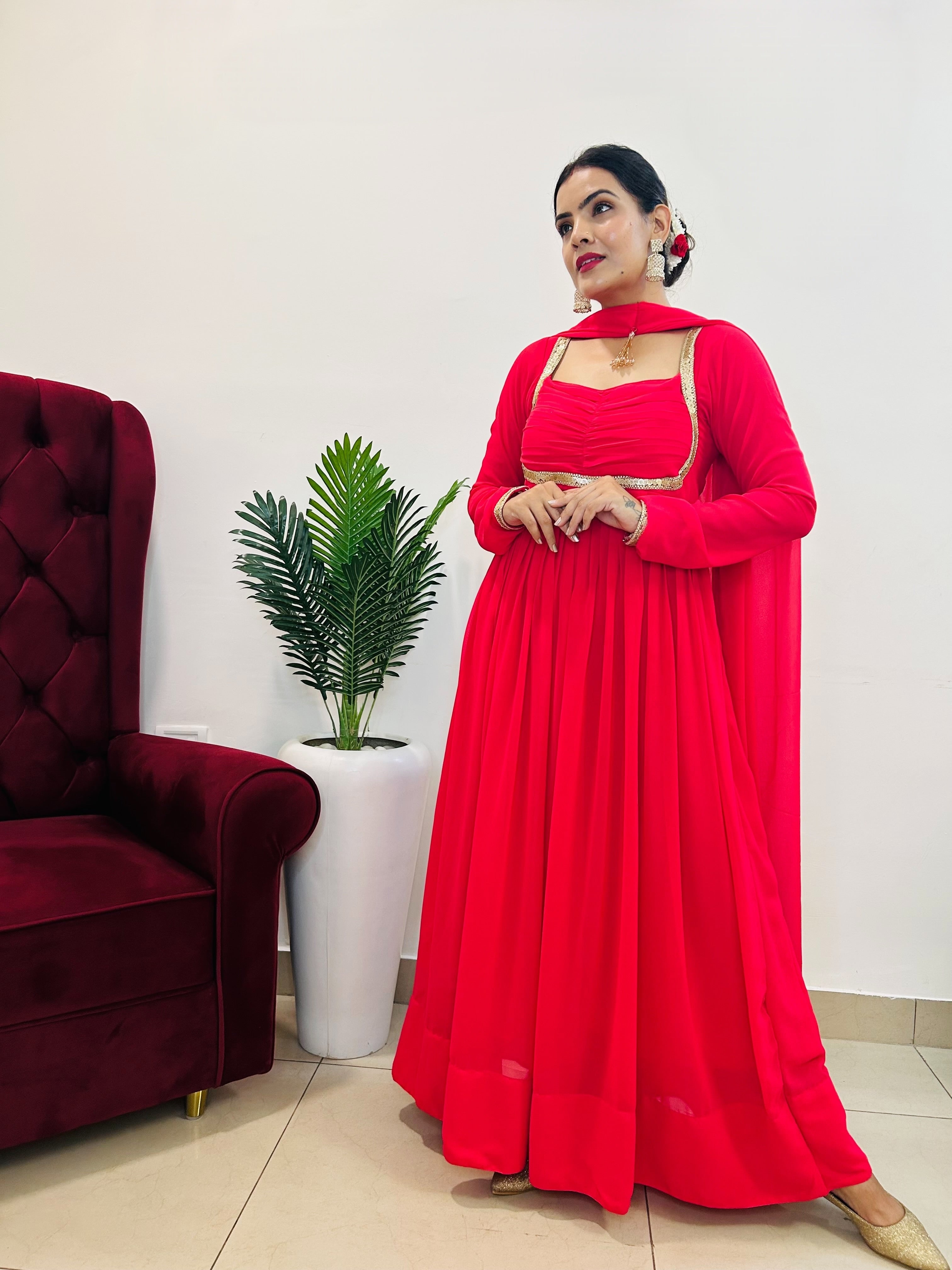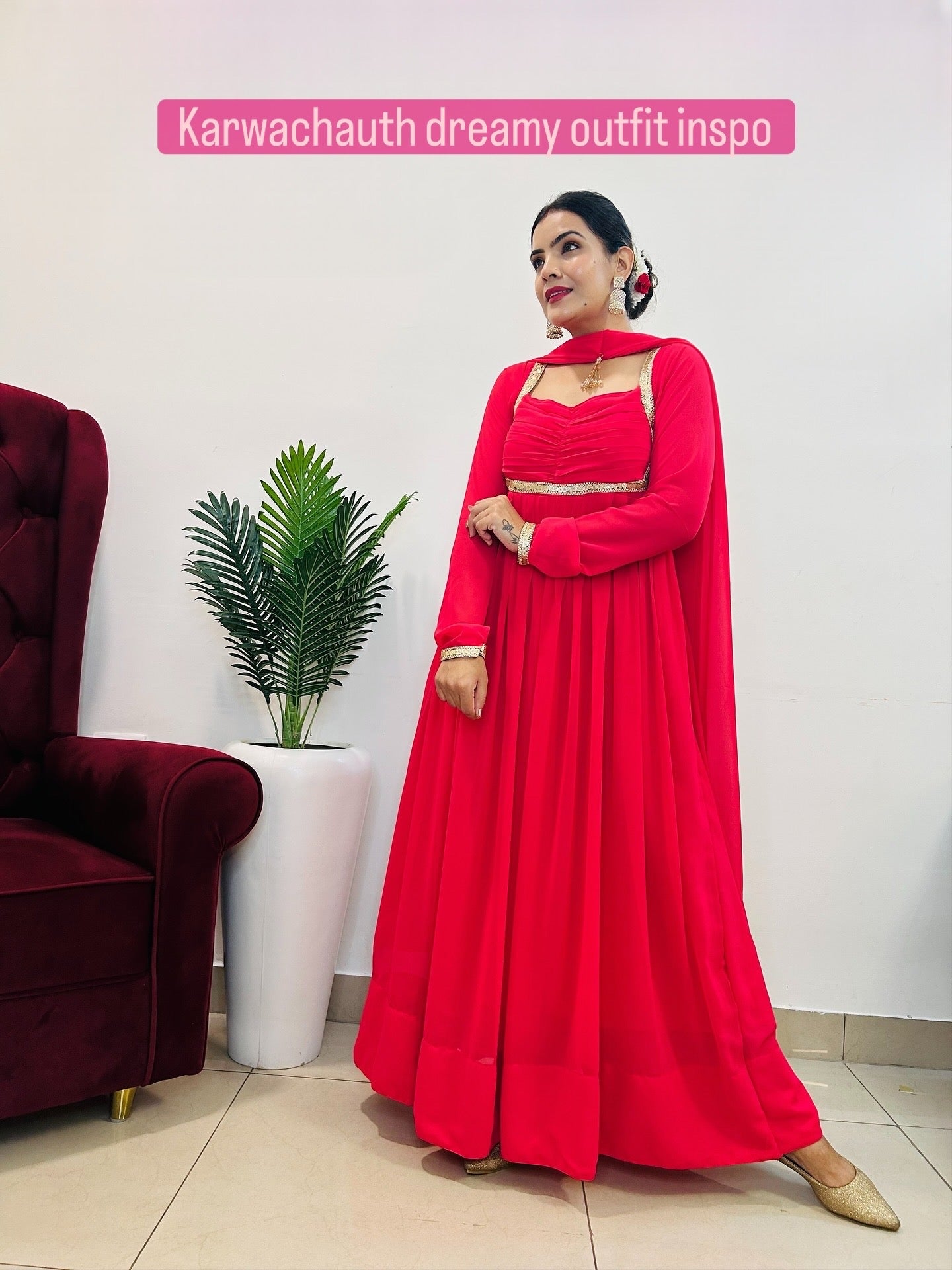 Get ready to shine in crowd on this beautiful red Anarkali suit with dupatta this karwa chauth .