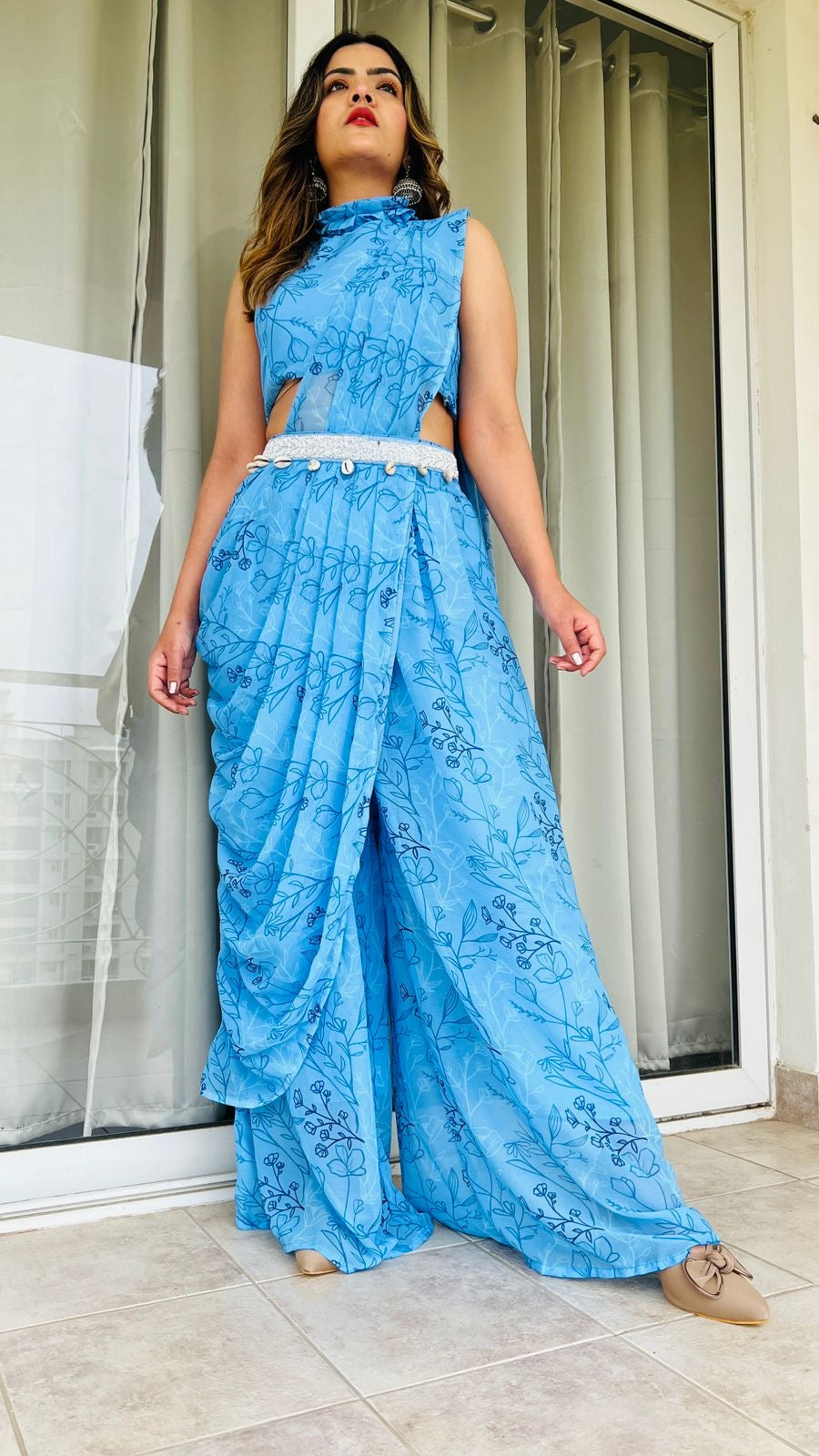 GET READY FOR THE FLORAL FEEL OF THE SEASON WITH THIS PALAZZO DRAPE SAREE EMBELLISHED WITH HANDWORK N KAUDI WAIST BELT
