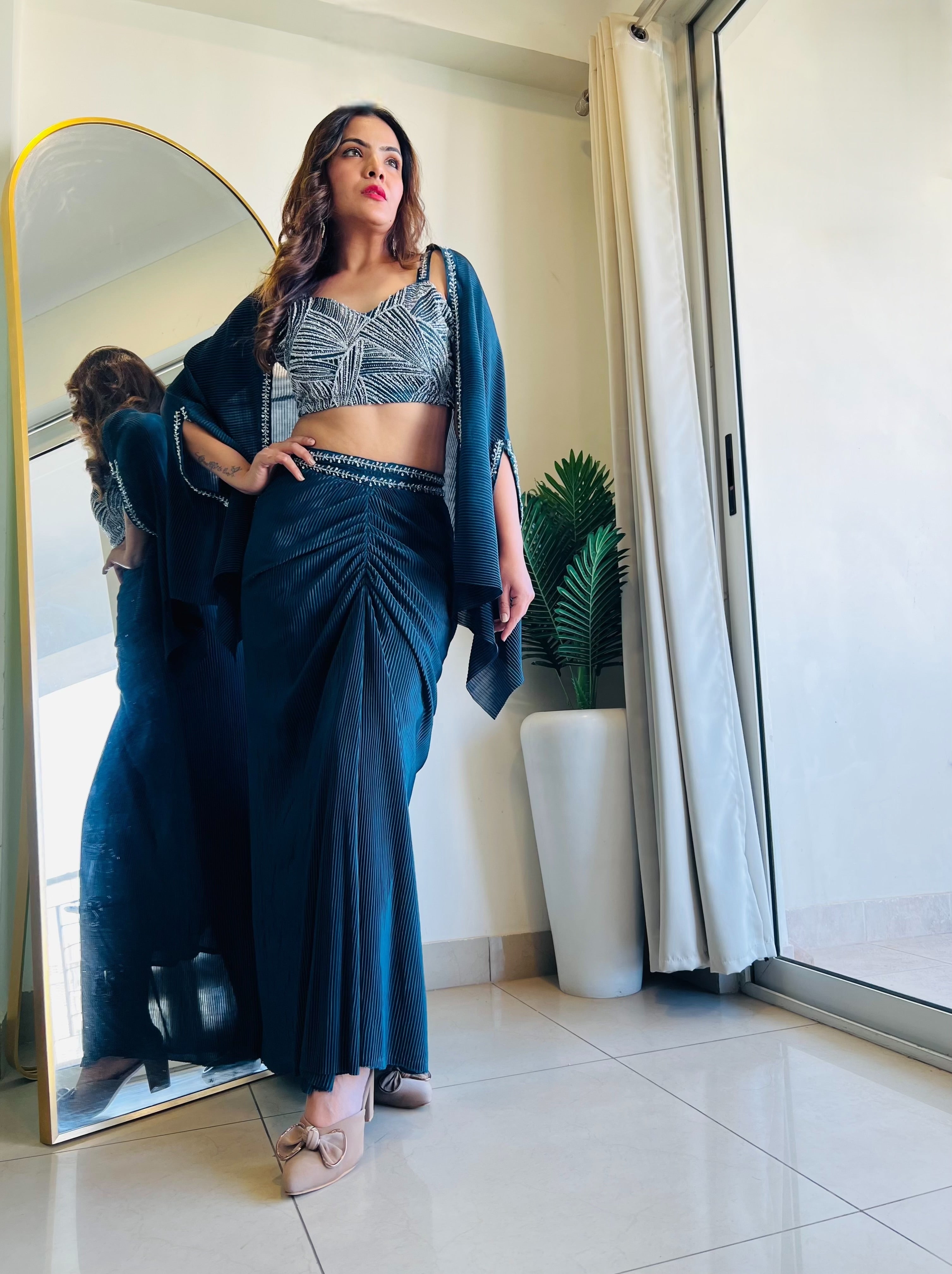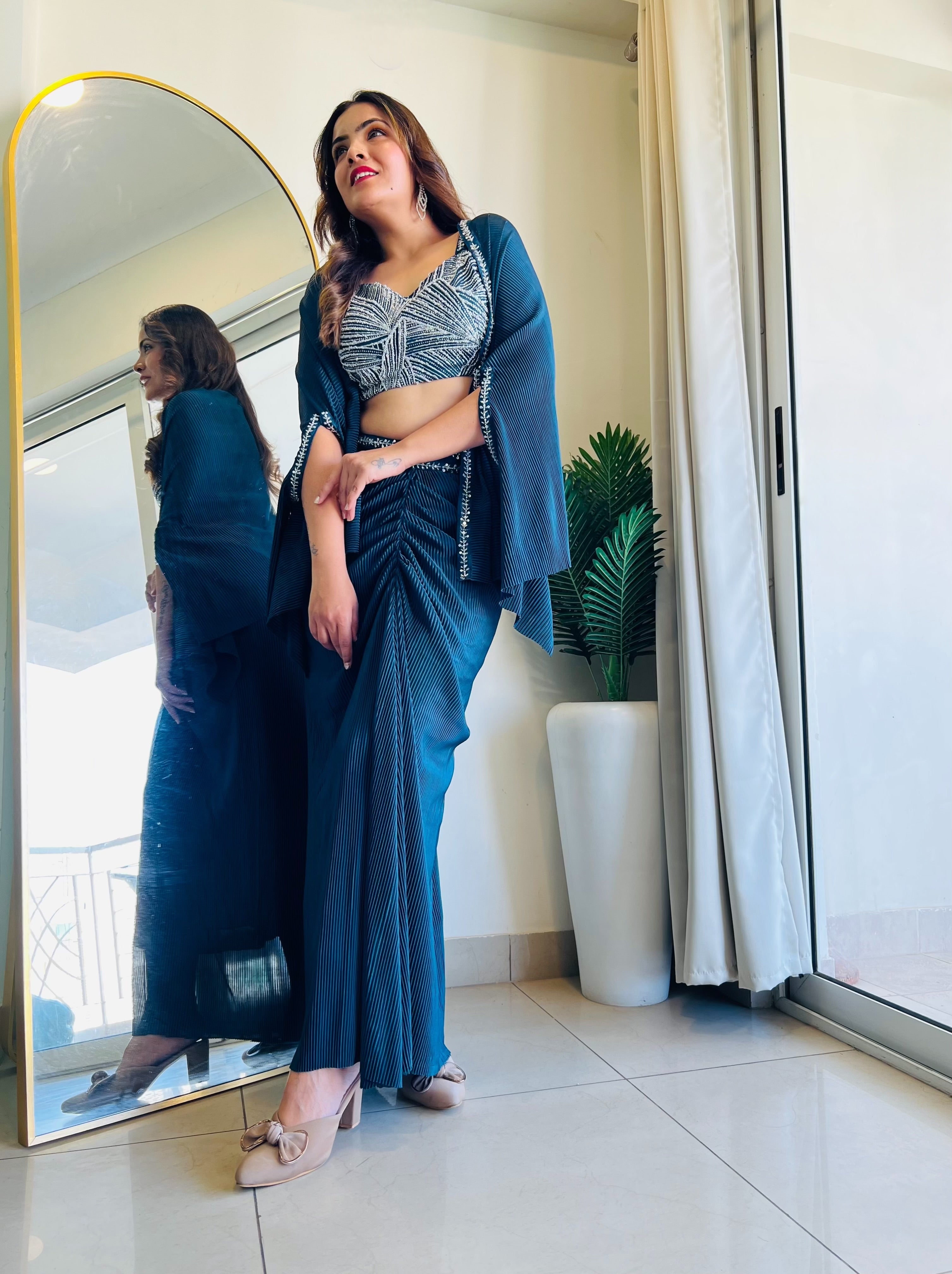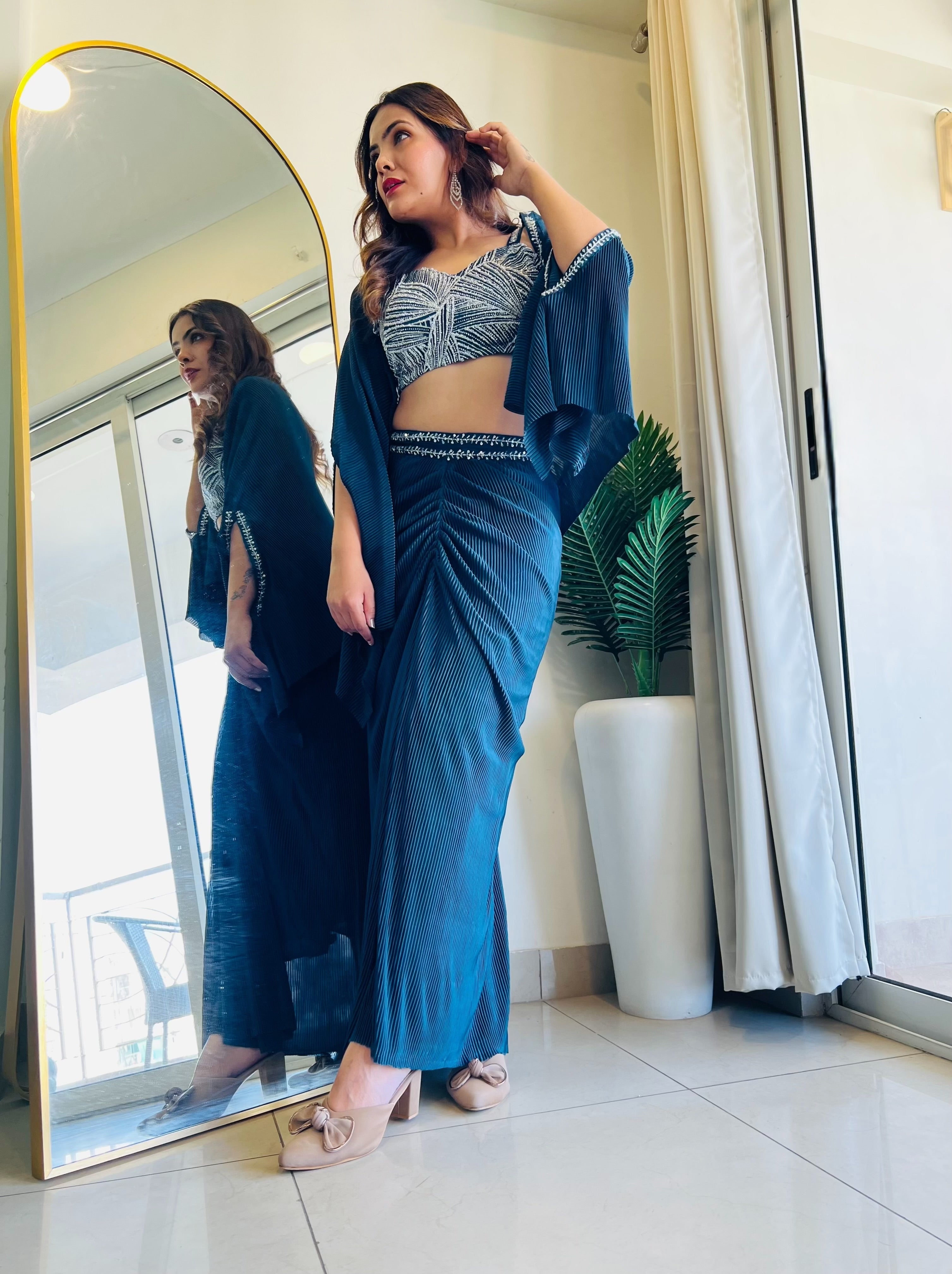 Get Ready For This Glamorous Pleated Lycra 3pc Designer Dress ,crop Top & Drape Skirt Is Teamed Up With Beautiful Cape Jacket In Perfect Teal blue Colour .the Most Trendy Colours For All Occasions.
